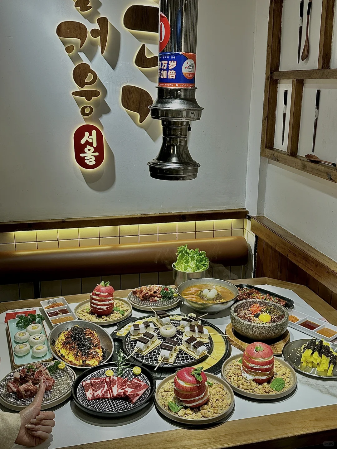 还没到饭点就坐满的韩式烤肉店 店内的韩式装修风格仿佛一秒到了韩国 不光烤肉很nice 还有特色的创意菜真的是又好看又好吃 . 苹果奶酥酸奶塔🍎好有圣诞氛围的一道甜品精选的糖心苹果加上一层层酸奶特别好看 火鸡面鸡蛋包🍝敲好吃的创意菜炒好的火鸡面淋满蛋液加上火腿肠芝士碎一起两面煎的焦黄焦黄的一看就很有食欲切开直接拉丝芝士满满太好吃啦 🏠朴太院·烤肉万岁·创意料理(鼓楼店) 📍中山南路456号