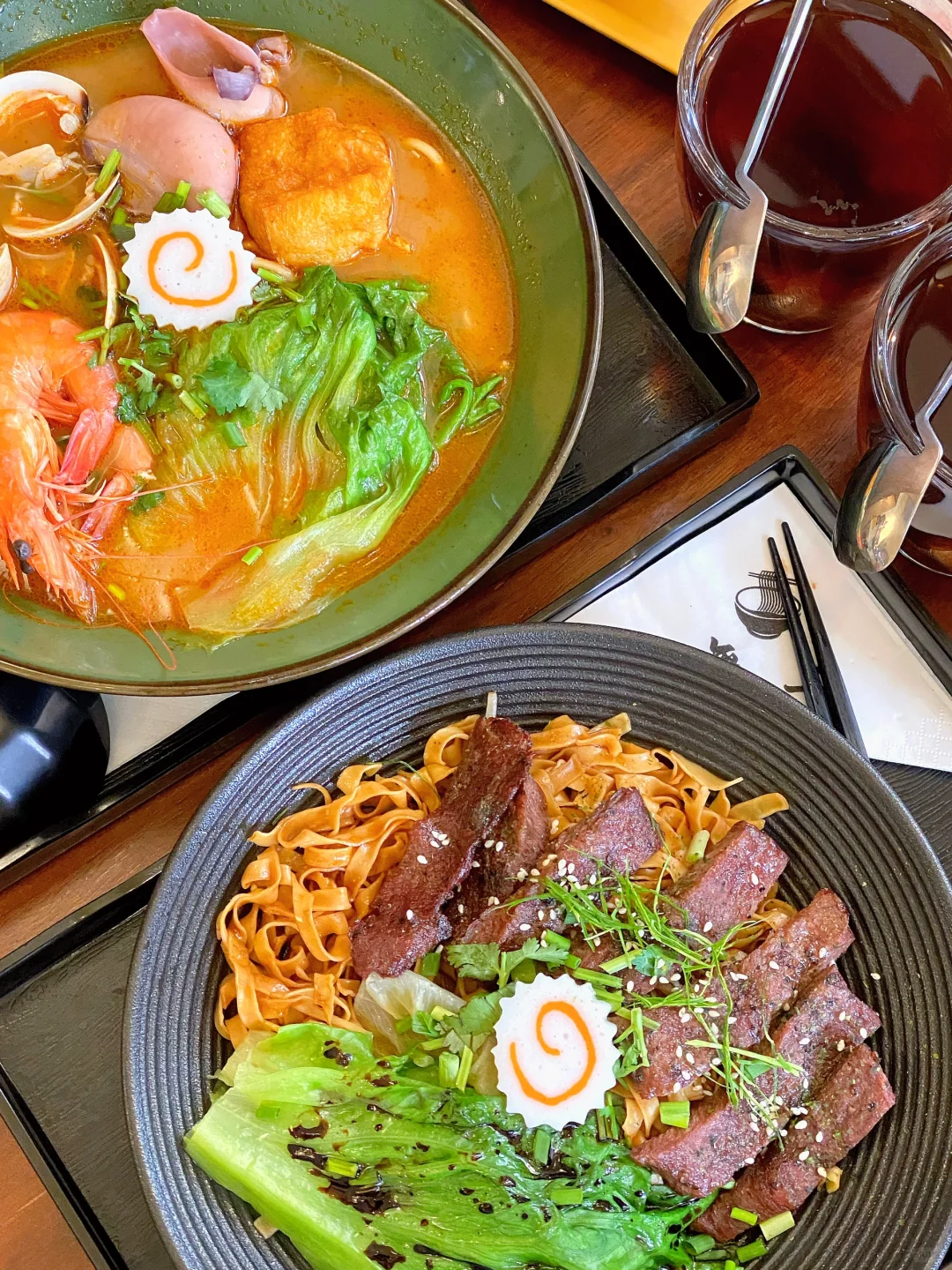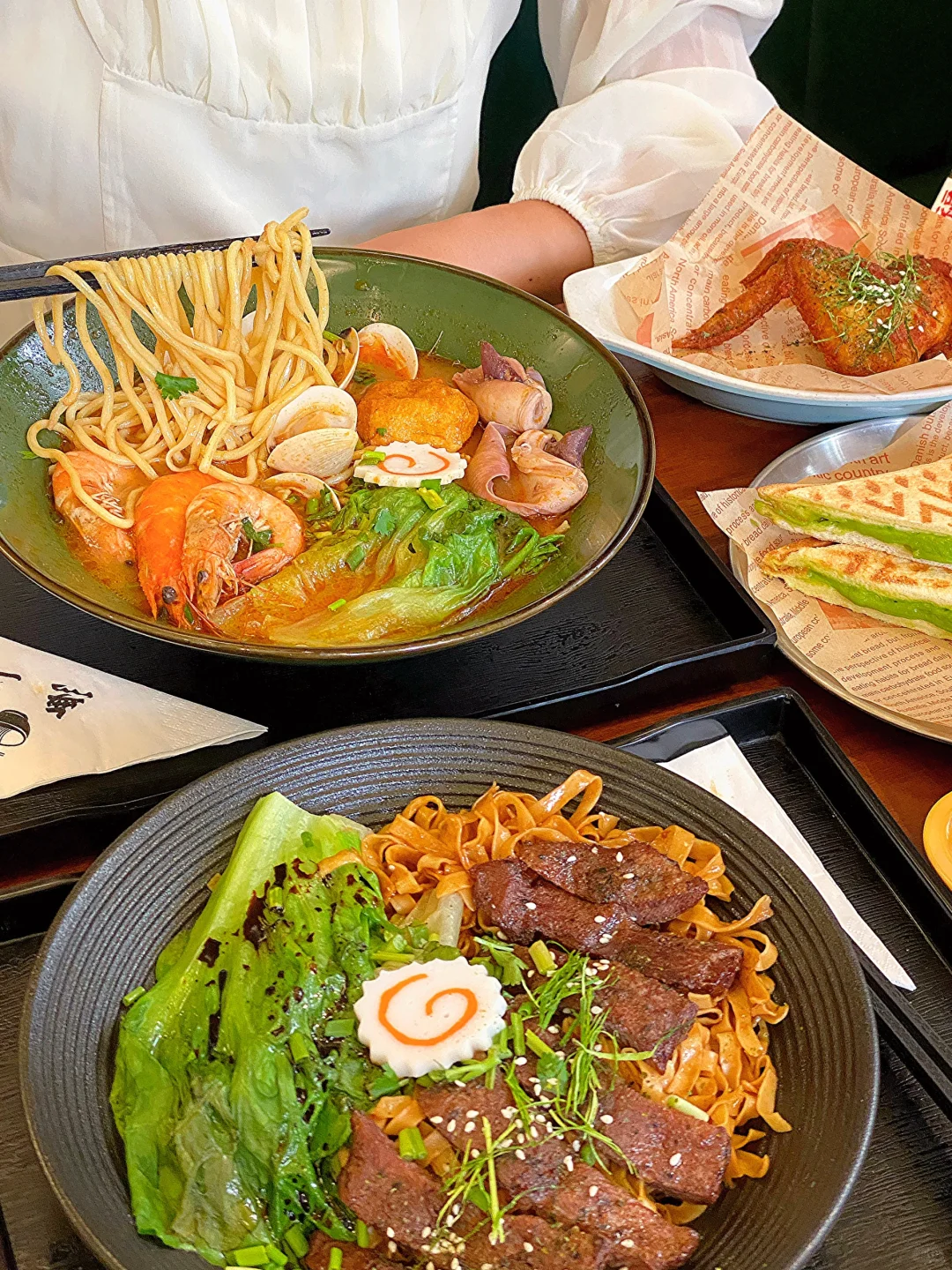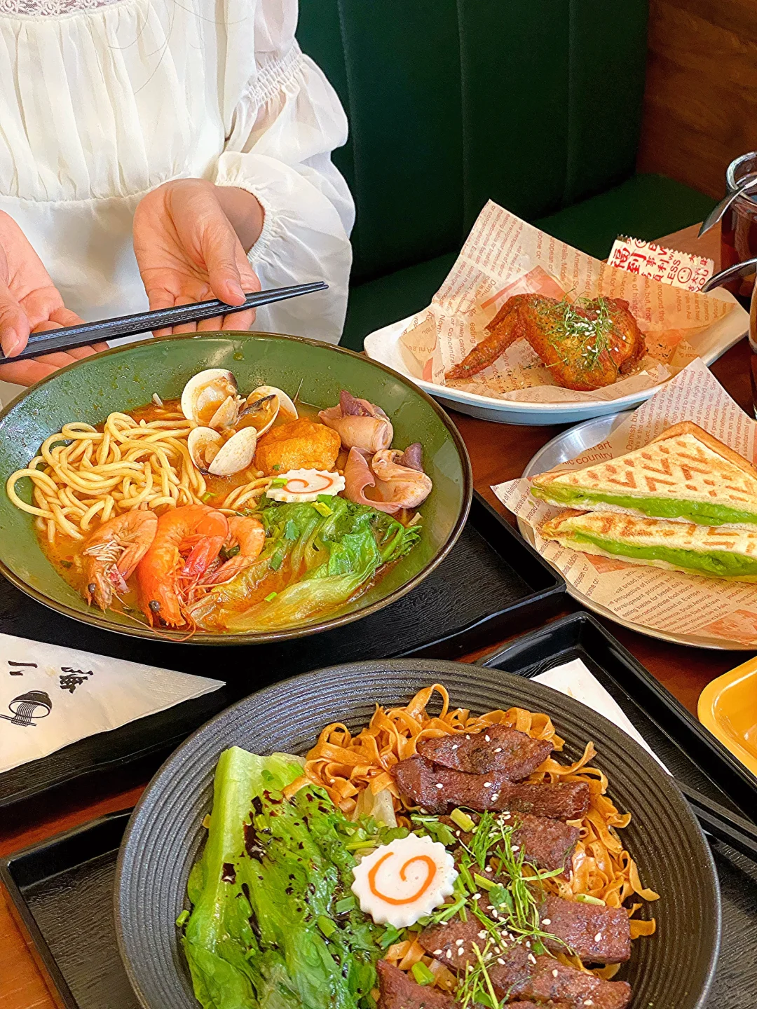 附近的朋友带去的… 吃过一次就爱上了! 沙茶面系列我很喜欢🤤 完全复制了厦门的味道诶~💯 〰️〰️ 🍜三鲜海鲜沙茶面 汤底很正!鲜甜又浓郁 搭配着大虾、贝类… 配着沙茶面吸溜一下根本停不下来~ 入口那刻被治愈了✨ 〰️〰️ 🥩牛扒捞粗 裹满酱汁的粗面劲道又入味 ➕上香嫩厚实的牛扒 满满幸福的味道~ 〰️〰️ 小吃也很赞👍 柠香鸡翅和斑斓飞碟🥪 都好清新啊! 〰️〰️ 店不大,但待着很舒服💯 原木装潢🪵搭配着墨绿色沙发 温馨又🈶️氛围 门口还有吧台位~也很适合一人食 📍无二面馆
