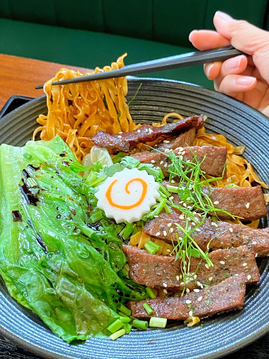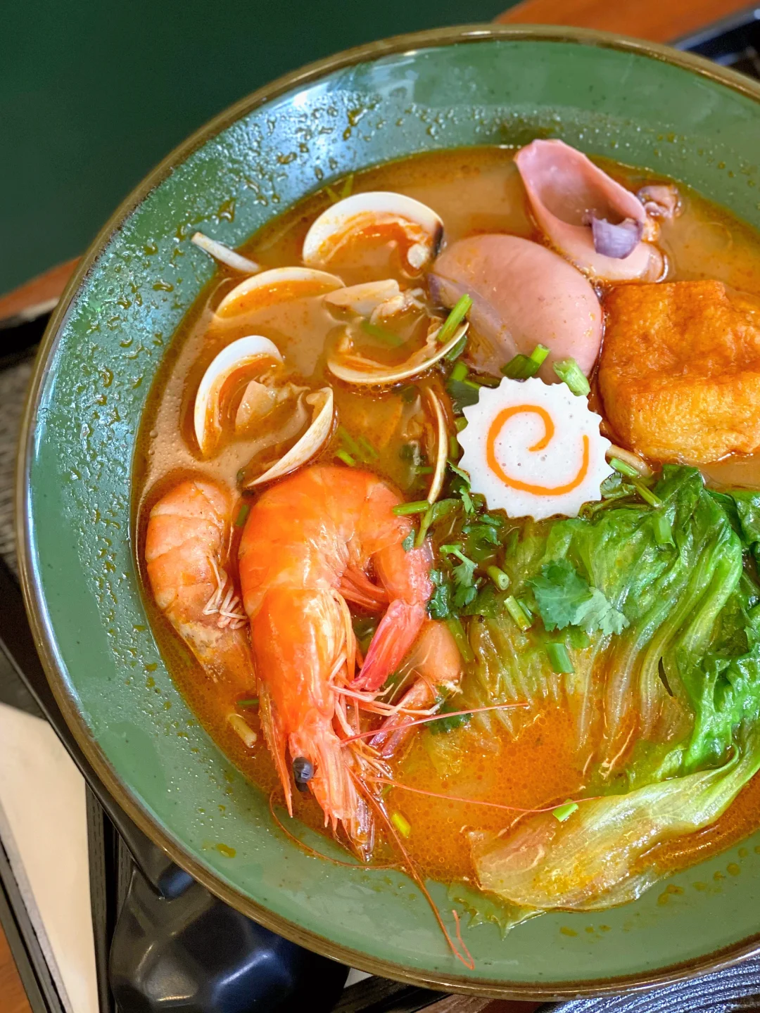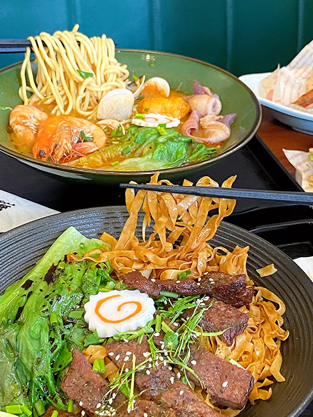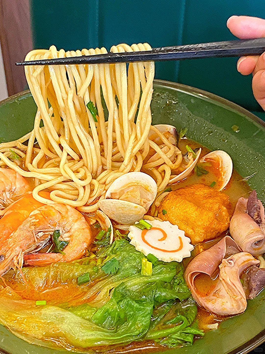 附近的朋友带去的… 吃过一次就爱上了! 沙茶面系列我很喜欢🤤 完全复制了厦门的味道诶~💯 〰️〰️ 🍜三鲜海鲜沙茶面 汤底很正!鲜甜又浓郁 搭配着大虾、贝类… 配着沙茶面吸溜一下根本停不下来~ 入口那刻被治愈了✨ 〰️〰️ 🥩牛扒捞粗 裹满酱汁的粗面劲道又入味 ➕上香嫩厚实的牛扒 满满幸福的味道~ 〰️〰️ 小吃也很赞👍 柠香鸡翅和斑斓飞碟🥪 都好清新啊! 〰️〰️ 店不大,但待着很舒服💯 原木装潢🪵搭配着墨绿色沙发 温馨又🈶️氛围 门口还有吧台位~也很适合一人食 📍无二面馆