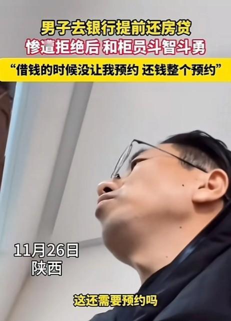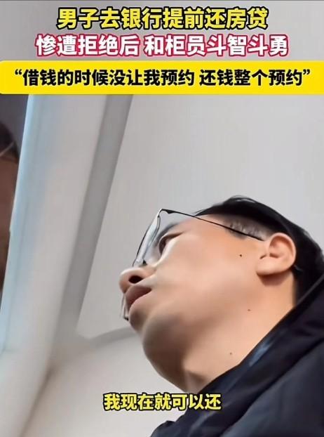 11月26日,陕西,男子前往银行想要提前还清房贷,却遭拒绝。男子对此感到十分不满,他认为在借钱的时候并未被要求预约,而还钱却要预约,这分明就是银行想多赚取利息。此事在网上引发热议,网友们纷纷表示这是常见的套路。 林先生在这座繁华的城市奋斗多年,终于拥有了一套属于自己的住房。为了实现这个梦想,他向银行贷款,签下了多年的还款合约。 林先生凭借着自己的努力和拼搏,手头也有了足够的资金。这天,他心中突然涌起一个念头:提前还清房贷,早日摆脱债务的束缚。 说干就干,林先生满怀期待地来到银行。一进大厅,他便径直走向柜台,对银行工作人员说:“你好,我想办理提前还贷手续。” 工作人员说道:“先生,提前偿还房贷是需要进行预约的。如果您选择线下预约的方式,大概需要等待60天的时间;若是线上预约,也得等上 45 天。” 林先生疑惑地说:“这是我的钱,为什么不能随时归还呢?我有能力提前还款,既可以减少未来的利息支出,又能让自己轻松一些,银行凭什么设置这样的障碍?” 工作人员无奈地回应道:“这是系统控制,我们也没有办法。” 林先生一听,顿时火冒三丈:“系统控制?这是什么借口?你们银行应该有更合理的解决方案。” 他指着工作人员,语气强硬地说:“我要求银行给我写一份证明,明确未还款是因为银行设置的不合理预约制度导致的,在此期间所产生的利息绝对不应该由我来承担。你们银行既然坚持要求预约,那在等待预约的这段漫长时间里,凭什么要我来承担利息?这显然是不公平的。” 工作人员为难地说:“先生,我们不能随意出具这样的证明。” 双方陷入了僵持状态。 林先生坚定地说:“提前还款是我的合法权益,银行不能以系统控制为由剥夺我的权利。如果你们不能给出一个合理的解释和解决方案,我将采取进一步的行动。” 银行柜员依然坚持要预约,无论林先生如何理论,都没有改变他们的立场。林先生气得满脸通红,思考着下一步该怎么办。突然,他大声说:“既然你们这么不讲道理,那我就打投诉电话,我倒要看看有没有人能管得了你们。” 柜员一听,顿时慌了神。他们意识到问题的严重性,担心林先生的投诉会给银行带来不良影响。其中一个柜员赶紧说:“先生,您别激动,我们这就向领导申请特殊处理。” 经过一番紧张的沟通和申请,银行领导终于同意林先生立即还款。林先生长舒一口气,脸上露出了满意的笑容。然而,这个过程也让他对银行的服务产生了质疑。他看着工作人员,冷冷地说:“如果不是我坚持要投诉,银行可能不会这么快就同意我的要求。” 林先生的经历在网上引起了网友的热议。许多网友纷纷分享自己相似的经历。“我在提前还贷时也遇到了类似的情况,银行要求预约的时间很长,让人感到无奈。” 一位网友抱怨道。 “银行就是故意拖延提前还贷的时间,目的就是为了多收利息。” 另一位网友气愤地说。 一些网友指责银行欺负外行人,认为银行在面对不懂行的客户时,会坚持按照规定进行预约,而遇到懂行的客户就马上办理。“银行应该更加公平地对待每一位客户,不能因为客户的知识水平不同而采取不同的处理方式。” 一位网友正义凛然地说道。 对此,你有何看法呢? 参考信源:商丘广播电视台