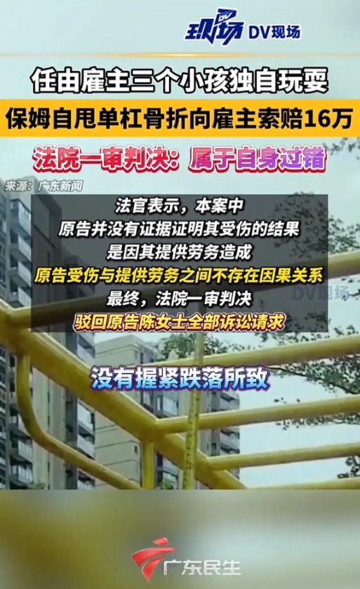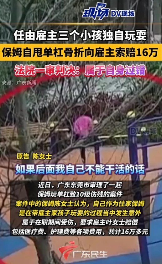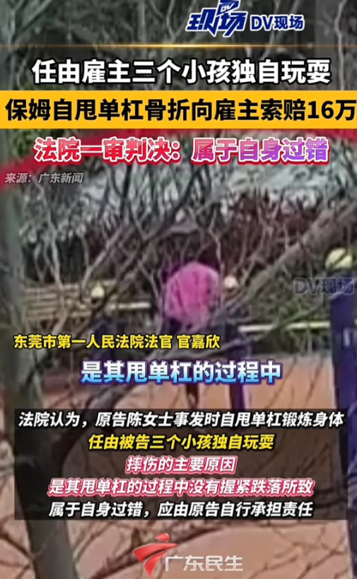 广东东莞,雇主让女子下楼取个快递。女子回来走到小区,看到雇主仨孩子在公共设施玩,心一痒痒,她也跑过去抓着单杠想锻炼锻炼。哪承想,没抓牢,从单杠上摔下来了!雇主赶紧通知女子家属,家人带她回去做手术,雇主给了15000块。完事儿后,女子非要雇主赔医疗费、护理费、残疾赔偿金共计16万多元。结果法院一判决,可把女子整傻眼了!