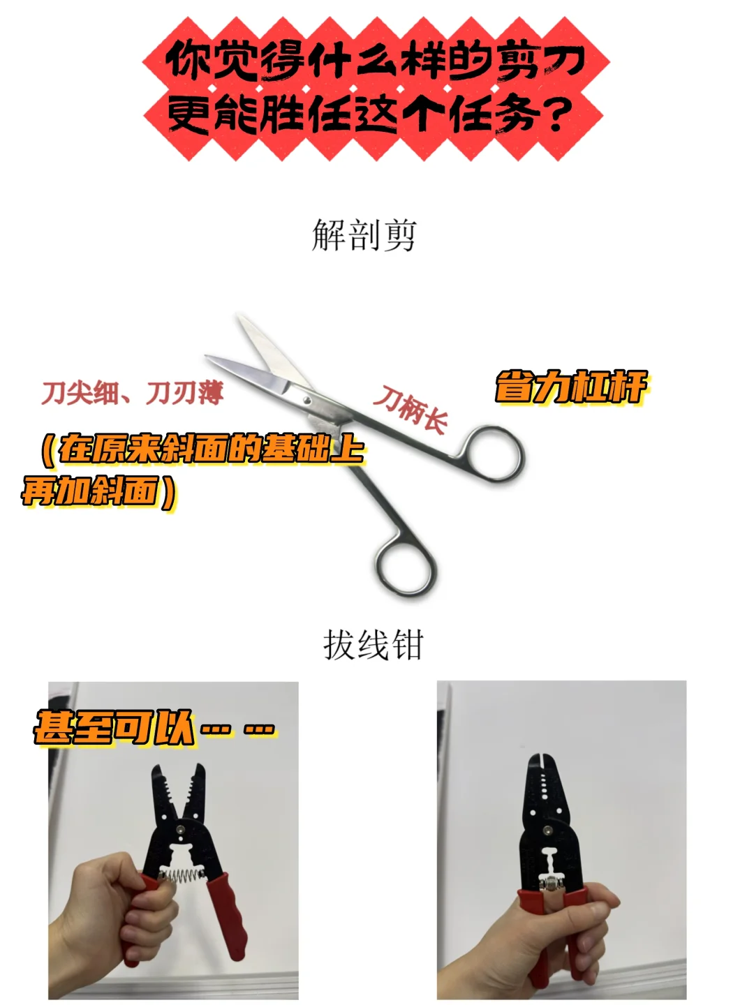因为很多人会忘记带剪刀,用的是学校比较钝的剪刀(刀刃是平面),那些从家里带来的锋利的剪刀(刀刃还有斜面)就能帮助学生想到这一点