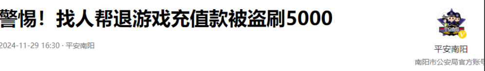 (参考信源:警惕!找人帮退游戏充值款被盗刷5000——2024-11-29 ·平安南阳)