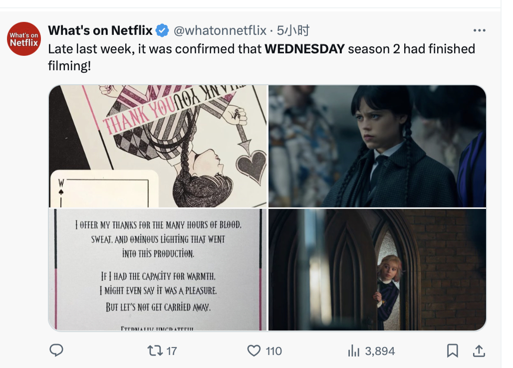 热门美剧《星期三》第二季宣布已经杀青!Lady Gaga加盟,第二季将于2025年上线网飞!
