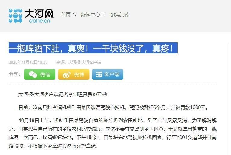 2020年10月,河南驻马店,一男子在自家农田,开农用拖拉机干活,早上带了一瓶啤酒,中午又累又乏,便喝了啤酒。不料,男子在回家路上被交警检测认定为酒驾,于是他的驾驶证被吊销 6 个月,还被罚款 1000 元,男子不服。 "我只是在自己的田里干活,开的又是拖拉机,怎么就成酒驾了呢?"王大汉只觉得天旋地转。 他怎么也没想到,自己干了大半辈子的农活,到头来却因为开拖拉机惹上了这么大的麻烦。 18日,王大汉像往常一样天不亮就起了床,准备去田里收割最后一块成熟的麦子。 他跨上那台陪伴他多年的老伙计——一台虽然略显陈旧但依旧动力十足的拖拉机。 引擎轰鸣声响起,激起一片尘土,很快消失在广袤无垠的金黄色麦田中。 烈日当头时,汗水早已浸透了王大汉的粗布衣衫。 他停下手中的活计,用布满老茧的手抹了把额头上的汗珠,从随身的蛇皮袋里取出一瓶冰镇啤酒。 这是他特意带来的"宝贝",为的就是这个酷暑难耐的时刻。 他坐在田埂上,慢慢品味着这来之不易的清凉,感受着麦浪随风起伏的节奏。 "啊,痛快!"王大汉仰头将最后一口啤酒倒进嘴里,满足地叹了口气。 此时的他,哪里会想到,这瓶看似无害的啤酒将给他带来怎样的麻烦。 兴致正高的王大汉决定再干会儿活。他重新爬上拖拉机,马达的轰鸣声再次响彻田野。 然而,就在他准备驾车从地头回家的路上,命运给他开了个天大的玩笑。 “接受检查。"两名神色严肃的交警拦住了王大汉的去路。 王大汉心里"咯噔"一下,但还是照做了。当酒精检测仪发出刺耳的警报声时,他的脸色瞬间变得煞白。 面对交警千元的罚款,更要被吊销驾驶证半年的处罚,王大汉急得直跺脚,声音都有些发颤:"警察同志,我真不知道这也算违法啊!我们村里谁家不是这样?干完活喝点酒,然后开拖拉机回家,几十年都这样,也没出过什么事啊。" 这驾照被扣了,那也意味着他的营生要断了,半年没办法干活,这可都是吃饭的家伙啊。 两名交警对视一眼,其中一位年长些的耐心解释道:"大叔,我理解你的困惑。但是根据《道路交通安全法》,拖拉机也属于机动车,而且你现在行驶的这条路虽然是乡间小道,但也属于道路范围。所以,即便是在田间地头,酒后驾驶拖拉机也是违法的。" "大叔,我们理解你们的习惯,但法律就是法律。为了你自己和他人的安全,必须严格执行。这次我们会依法对你进行罚款和暂扣驾驶证的处罚。" 王大汉彻底懵了。 他怎么也没想到,自己平日里再平常不过的一个举动,竟然触犯了这么多法律条款。 最终,法律的条文是冰冷的。 不管王大汉如何争辩,最终还是无法逃脱被处罚的命运。 消息如同长了翅膀,甚至在社交媒体上引发了热议。王大汉的遭遇成了网友们争相讨论的话题。 有人愤愤不平:"农民辛苦一天,也不容易,至于这么上纲上线吗?" "拖拉机又不是汽车,在自家地里开开怎么了?"另一位网友附和道。 然而,也有持不同观点的声音。 "别只顾着抱怨,法律面前人人平等,农民也不能例外。酒后驾驶的危险性,在哪儿都一样。安全第一,别等出了事再后悔。"一位网友如是说。 "我倒觉得执法没错。农村交通事故多发,不少就是酒驾导致的。与其事后痛哭,不如事先预防。大家都注意安全,才是真的为农民好。"另一位网友表示赞同。 对此,你有何看法呢? 参考信源:大河报《一瓶啤酒下肚,真爽!一千块钱没了,真疼!》
