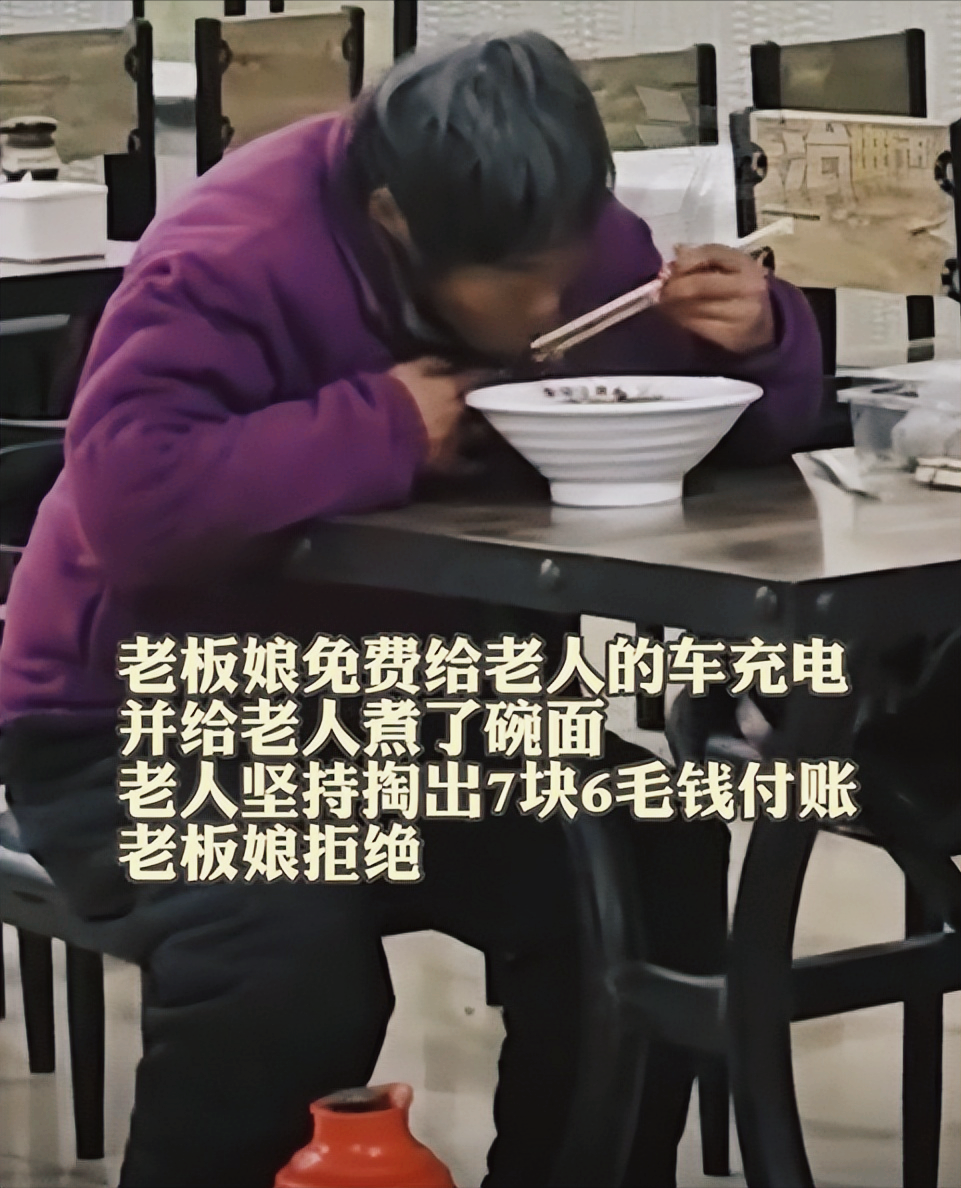 河北廊坊,一老人询问面馆老板能否在她的店铺里给电车充电,得到允许后的老人缩在餐馆角落啃馒头吃,老板娘见状,给她下了碗面,事后,老人坚持要给老板7块6毛钱,在交谈过程中,老板娘得知老人骑电车从北京天坛医院出发,准备回老家,老板娘将这一幕拍下发到网上,引来多名网友接力寻人。