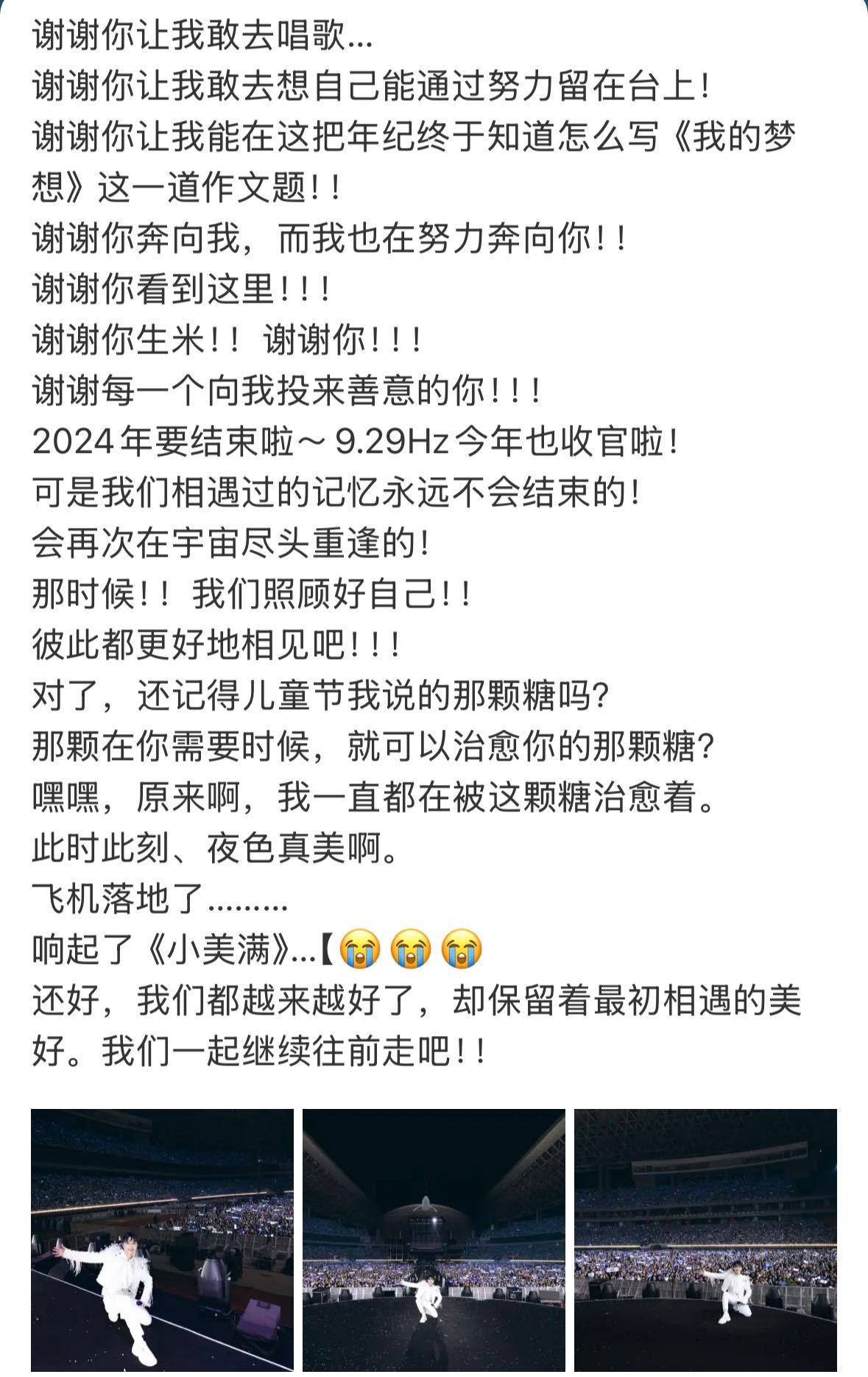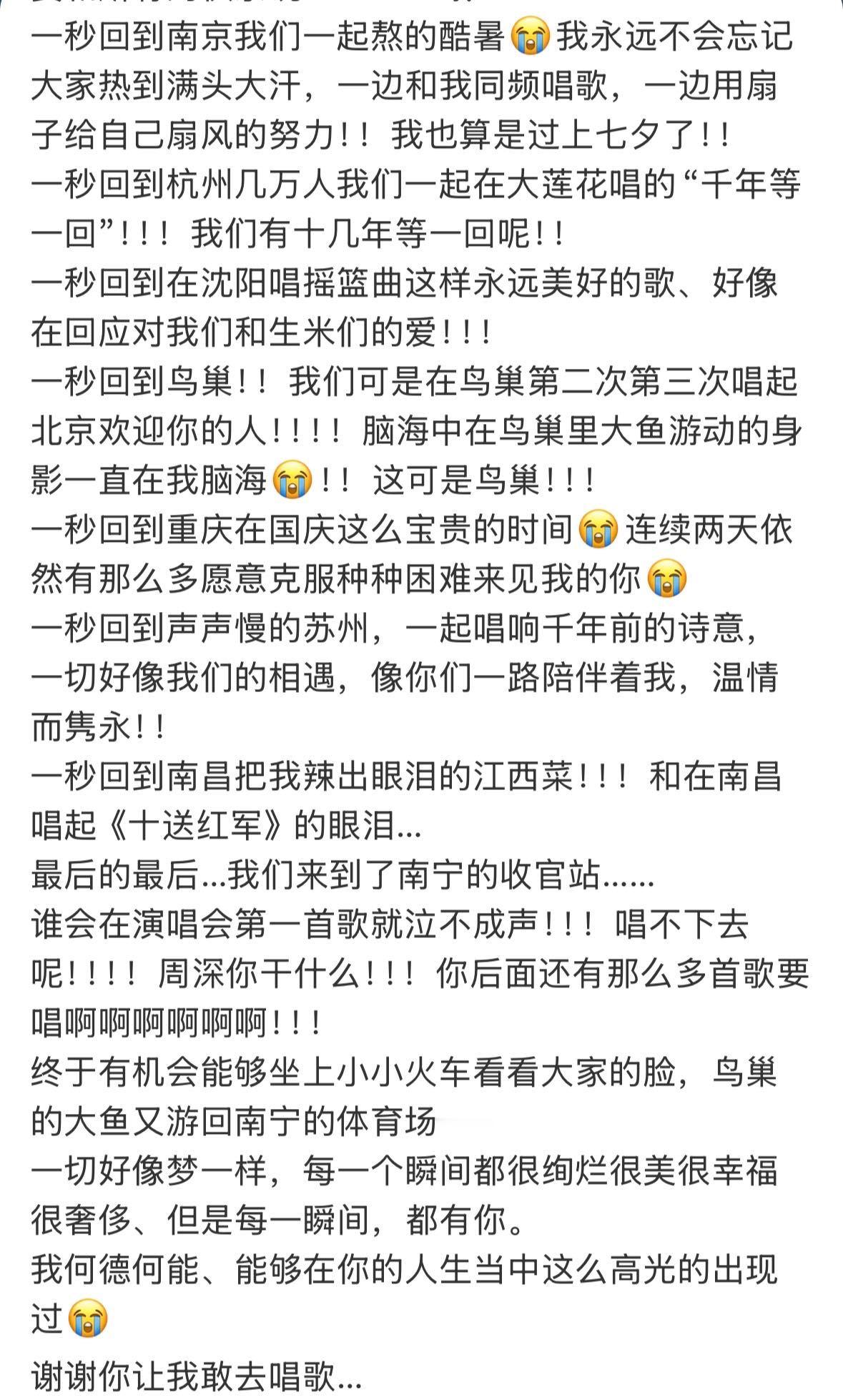 周深千字长文 周深2024巡演已经全部结束,周深发布了千字长文回顾今年13城巡演的难忘时刻,从9.29Hz在梅奔和观众的第一次见面的忐忑,到回到家乡贵阳的熟悉与爱意,再到登上鸟巢、最后来到南宁的泣不成声。我们随着周深的文字,也回顾了共同走过的一年,沉浸在9.29Hz的美好中,虽然今年巡演舞台已经结束,但我们会和周深相遇在更好作品和舞台上!