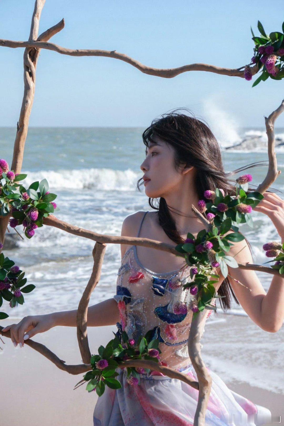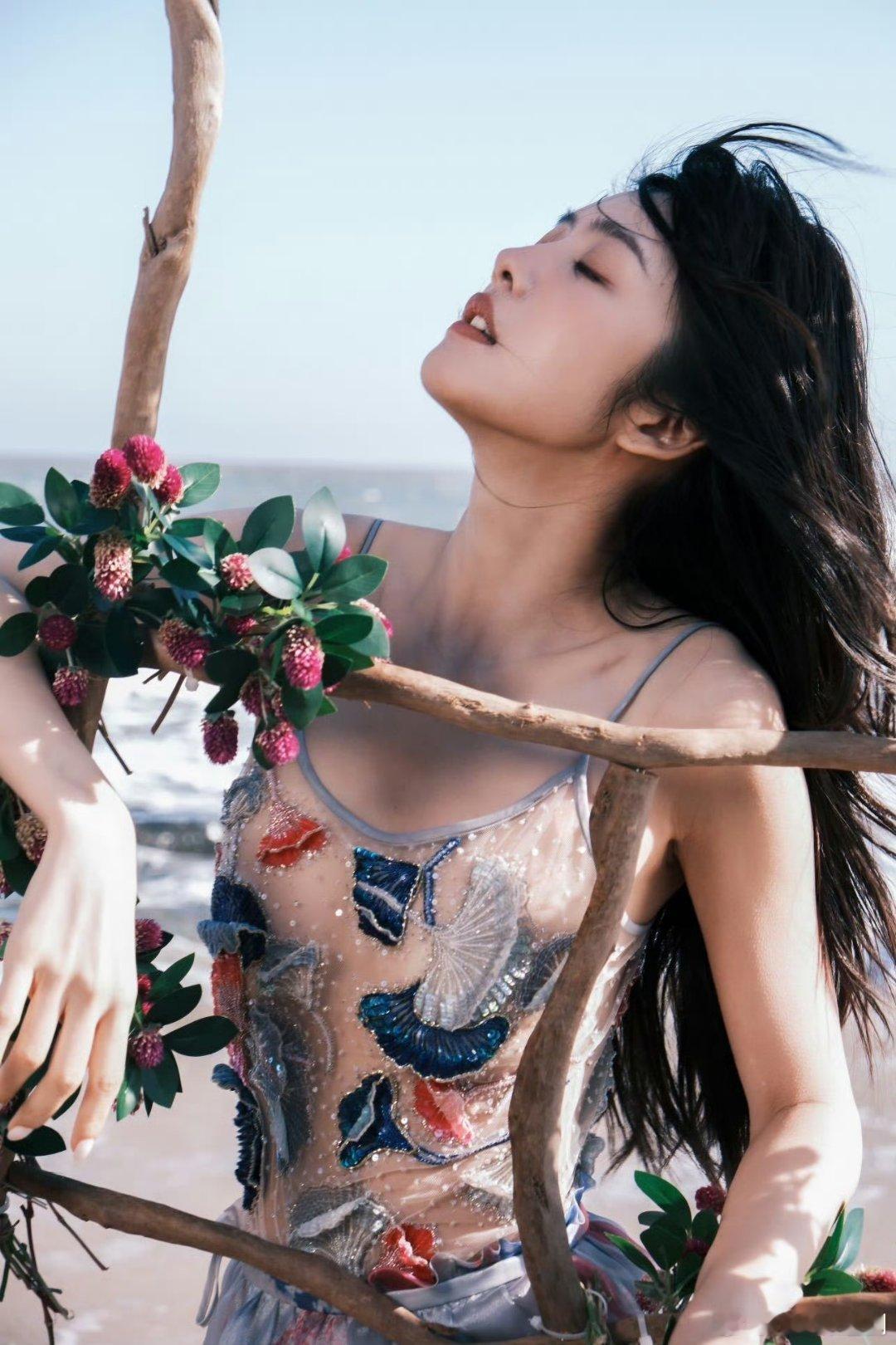 蔡文静海的女儿 蔡文静花海氛围感 海边的花海加上昏暗的灯光,蔡文静穿蓝裙配黑纱,简直美翻了!!