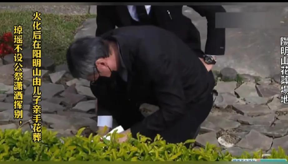 琼瑶阿姨的花葬仪式, 照片周围铺满了鲜花, 被黑伞遮住的是谁呢?