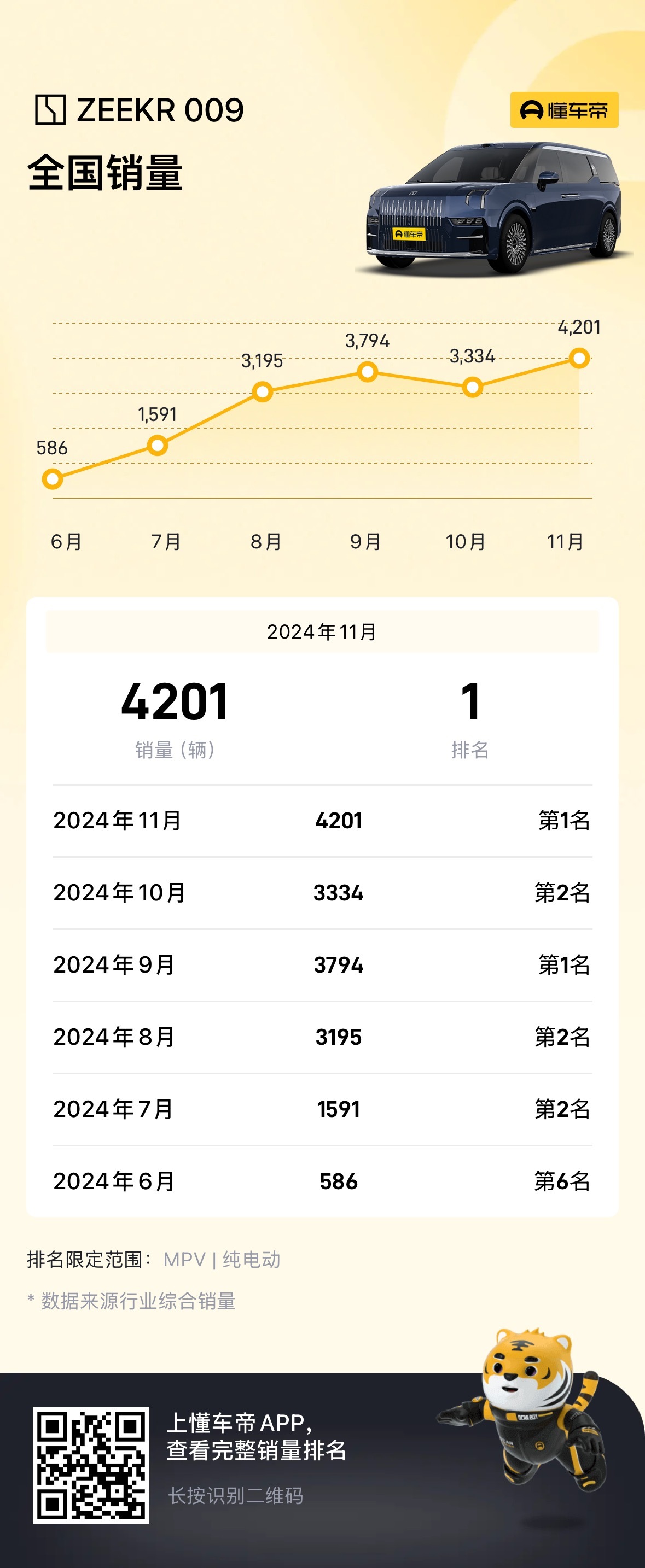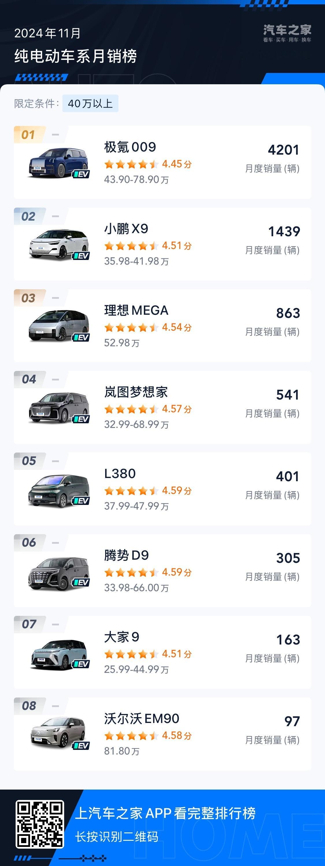 能满足这么多选车条件的,目前真的没几台。极氪 009 可以算一台,在排名榜上,极氪 009 拿下了 40 万纯电车型销量冠军和纯电 MPV 销量冠军。