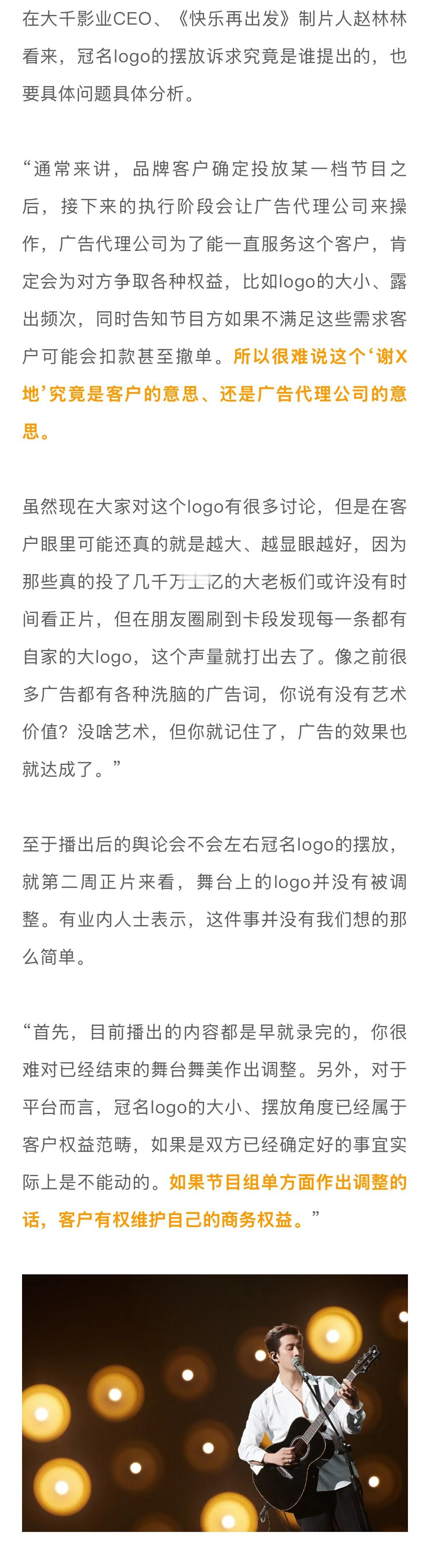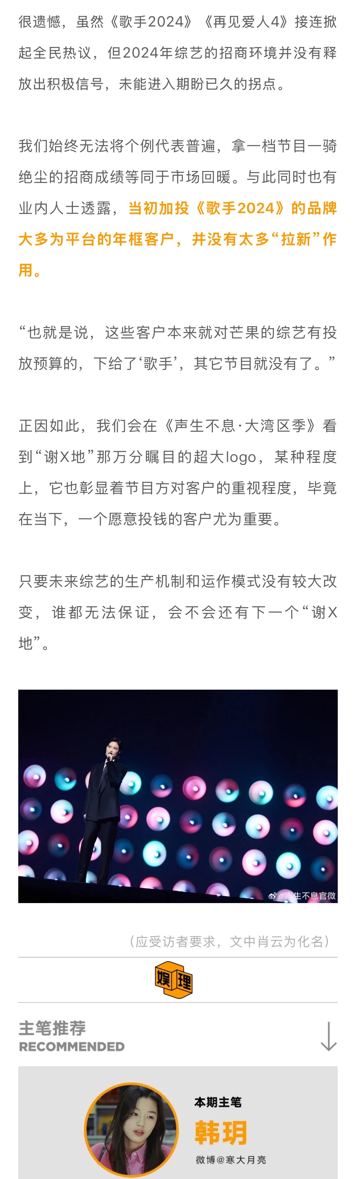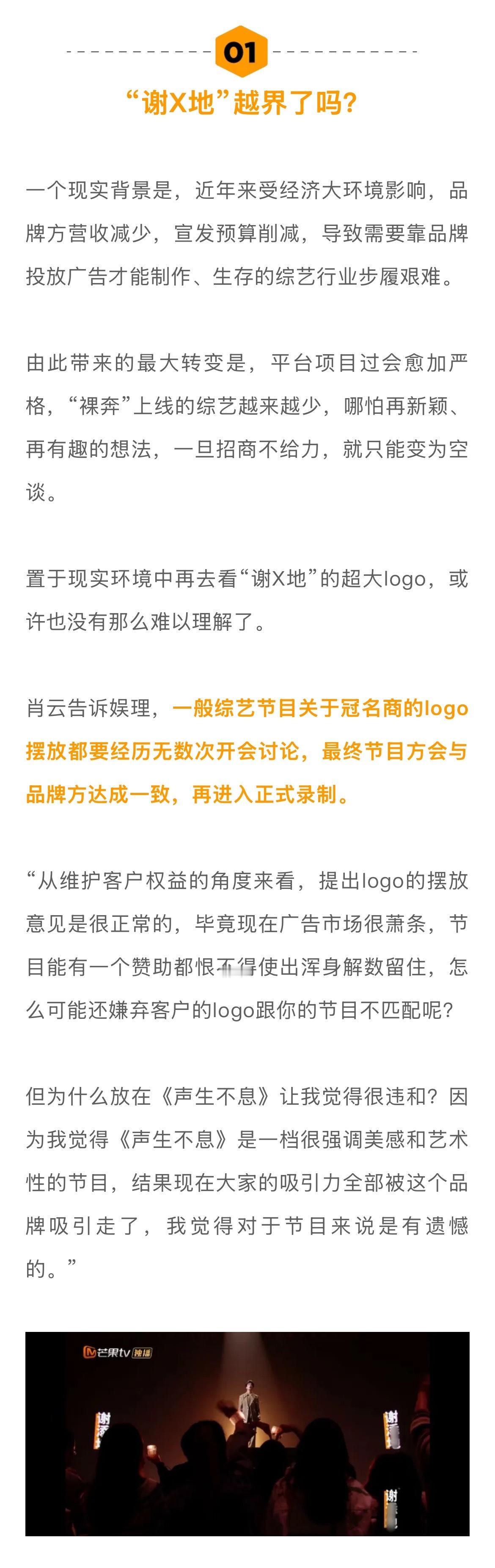声生不息的冠名商越界了吗 冠名定不下来 综艺不敢开工 “谢X地”意外成为被讨论的对象,入行多年的综艺制作人肖云只有“深深的无力感”。“这种事情也只有在内娱会发生吧,而且大家可以理解、接受,我不敢想象《黑白厨师》的舞美置景里面贴着三个大字会怎样,太破坏节目氛围了。”