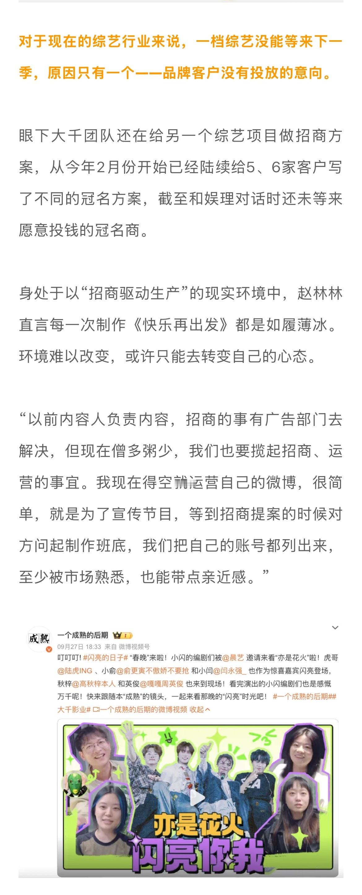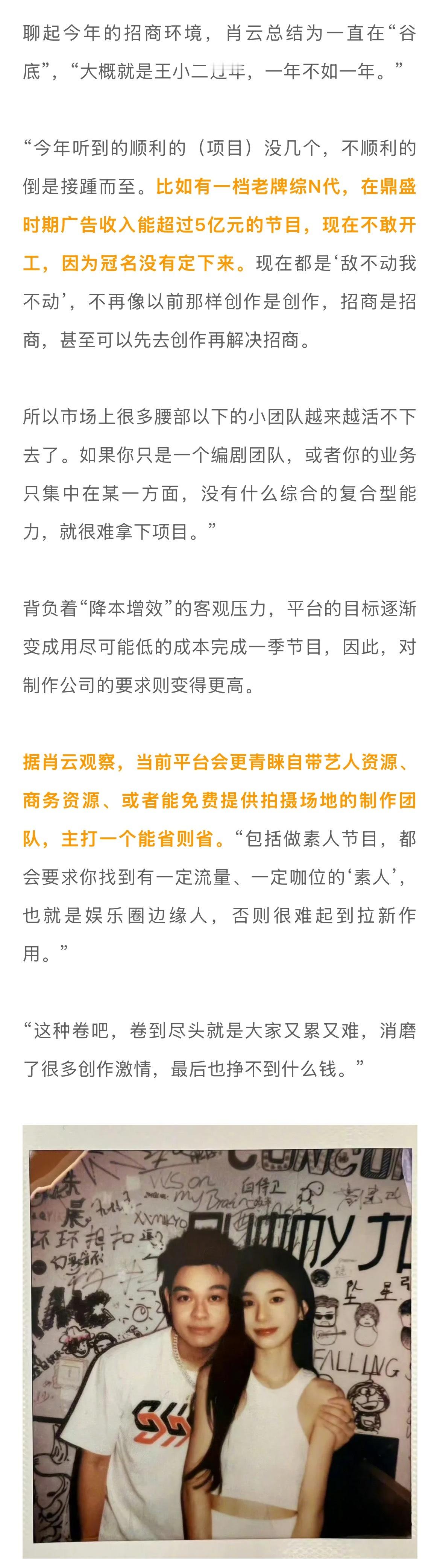 聊起今年的招商环境,肖云总结为一直在“谷底”,“今年听到的顺利的(项目)没几个,不顺利的倒是接踵而至。比如有一档老牌综N代,在鼎盛时期广告收入能超过5亿元的节目,现在不敢开工,因为冠名没有定下来…”请看 娱理独家 幕后调查...↓