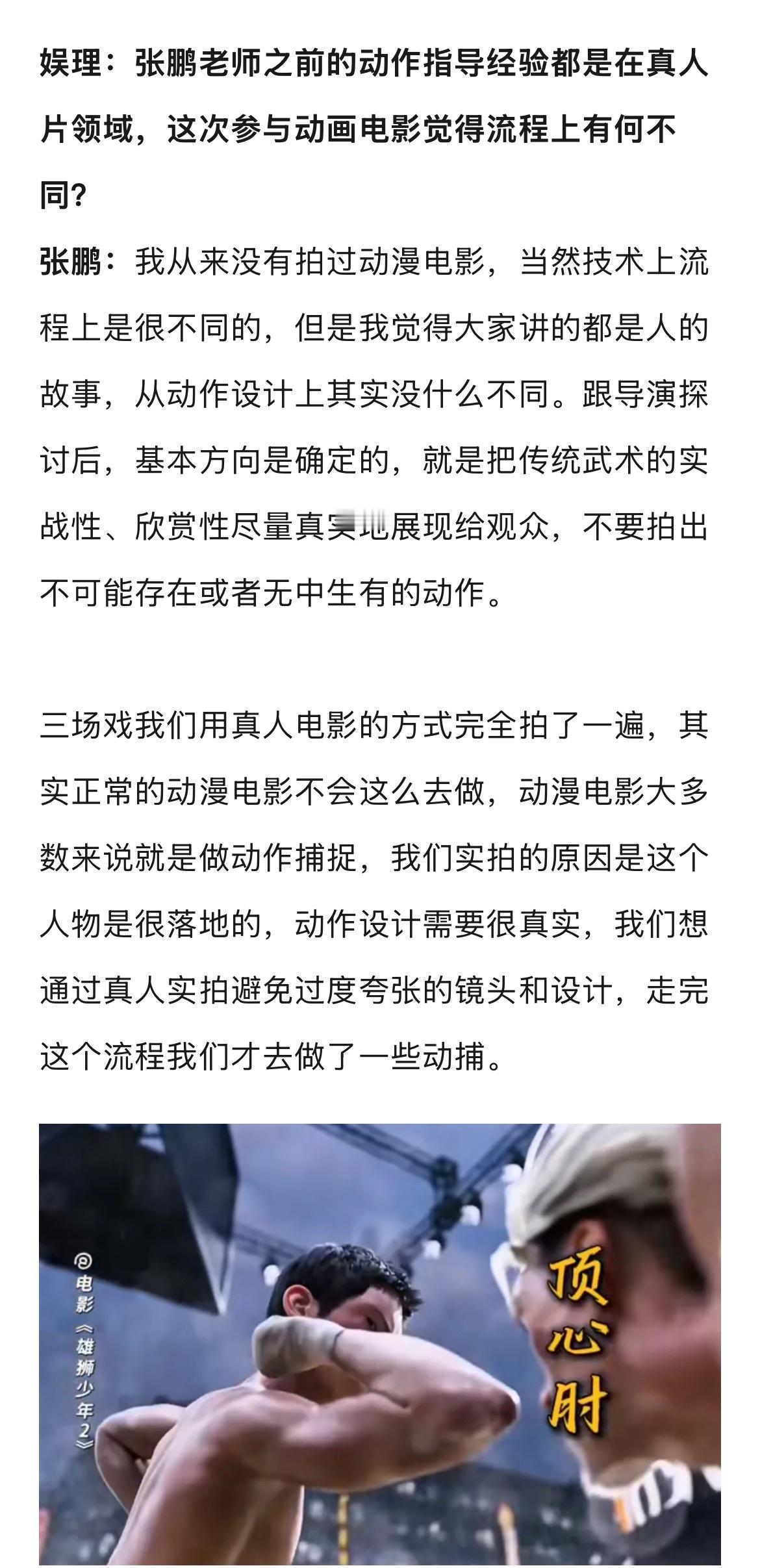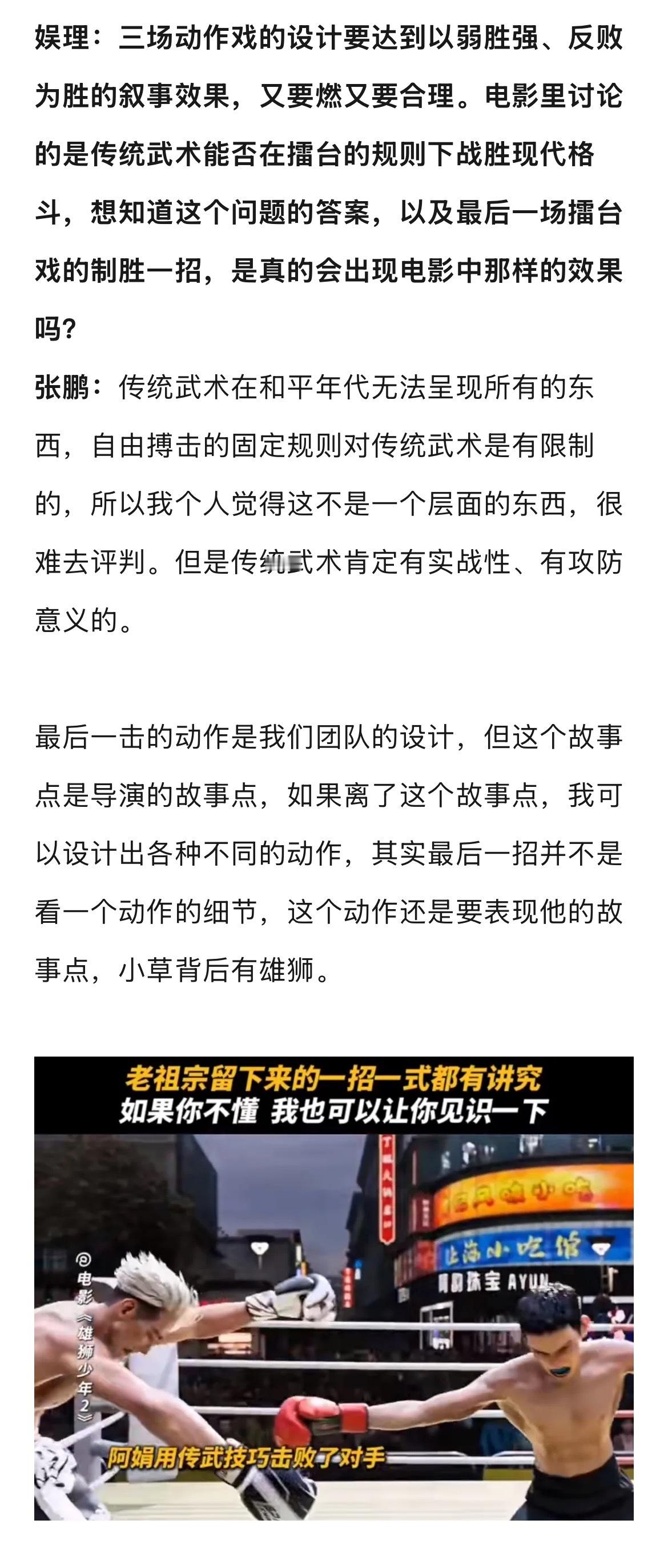 为了呈现将近20分钟的格斗戏,《雄狮少年2》邀请动作指导张鹏加入,“动作戏不能只是打,如果只是打得好看观众还是会疲劳的,必须得叙事。刚开始跟张鹏老师说要做格斗戏的时候,我让他自己去感受电影里三场重要的擂台戏到底什么样子,然后完全自由发挥去设计”…更多幕后故事,请戳 娱理独家 ↓