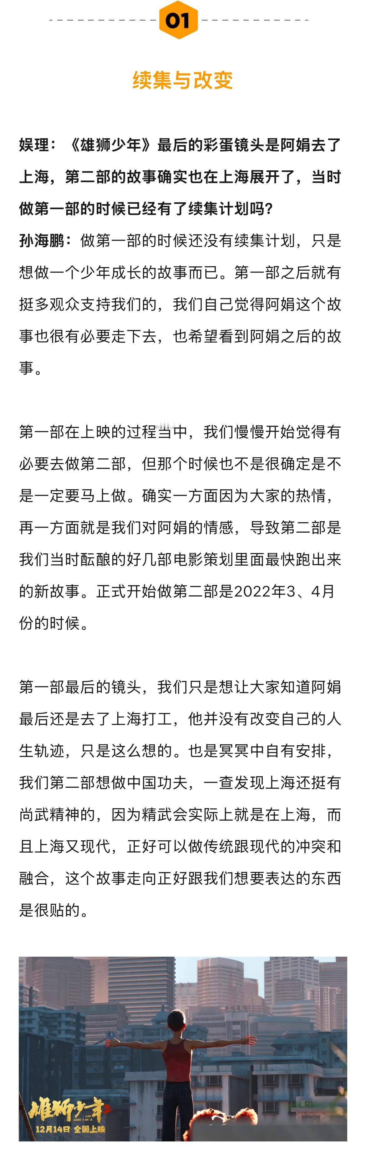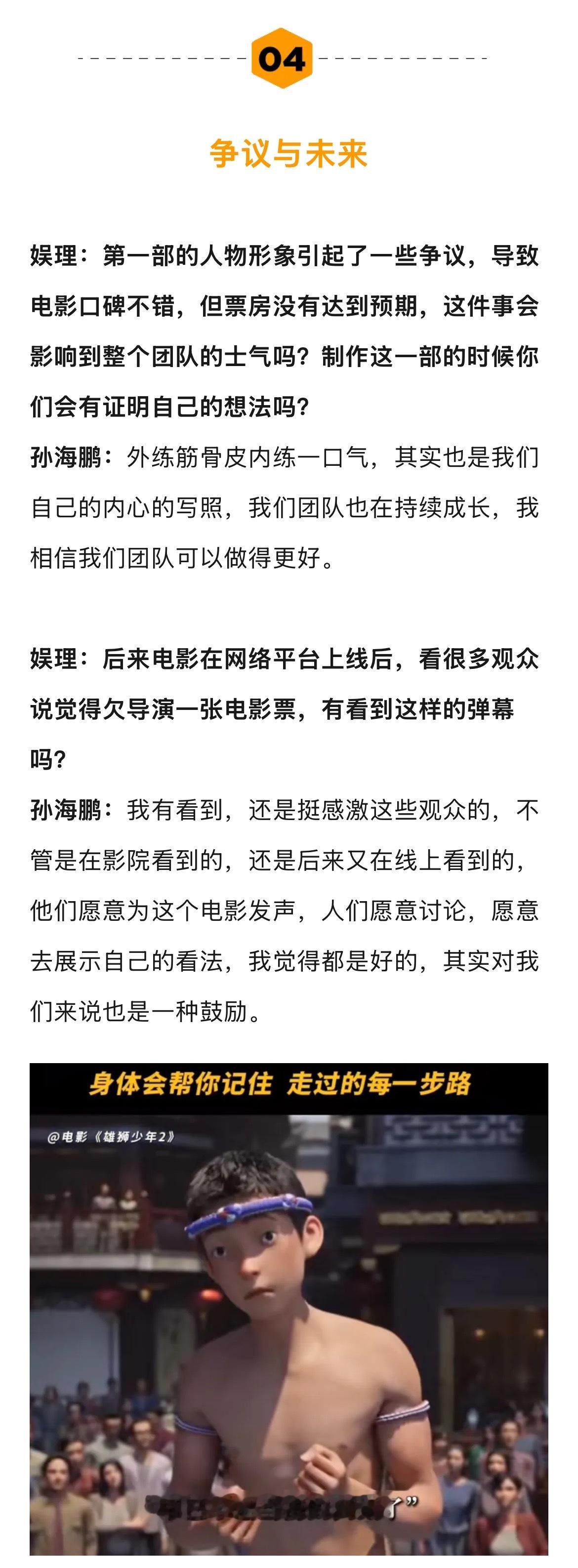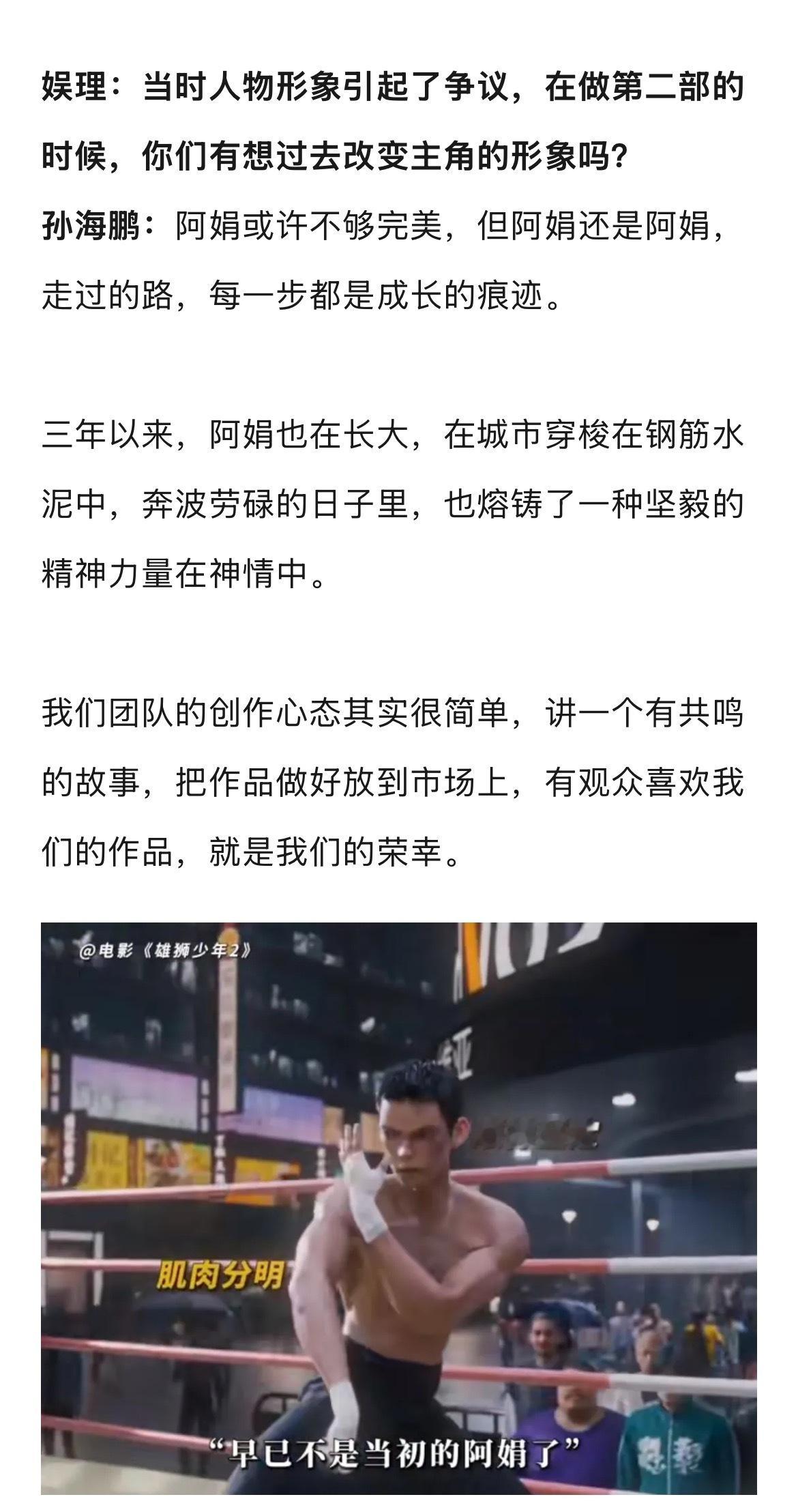 雄狮少年2擂台格斗戏含金量 雄狮少年导演说想做第三部 谈及第一部时的争议,《雄狮少年2》导演孙海鹏回应表示:“外练筋骨皮内练一口气,也是我们自己的内心的写照。”至于“欠导演一张电影票”的观众说法,他也表示很感谢:“他们愿意为这个电影发声,人们愿意讨论,愿意去展示自己的看法,我觉得都是好的,其实对我们来说也是一种鼓励。”