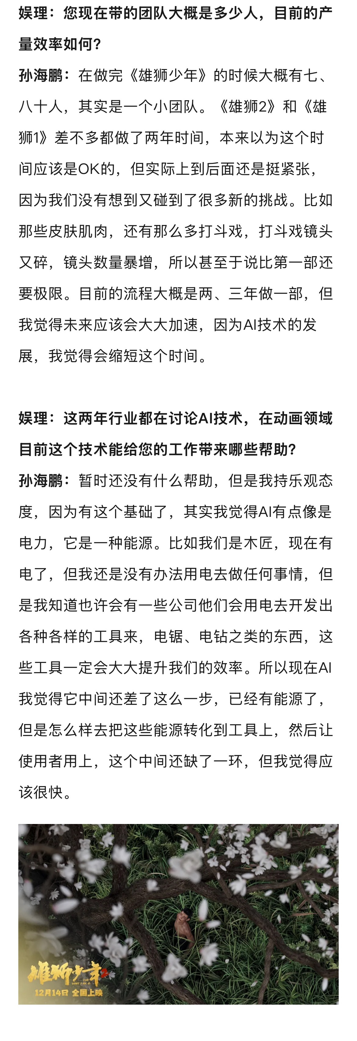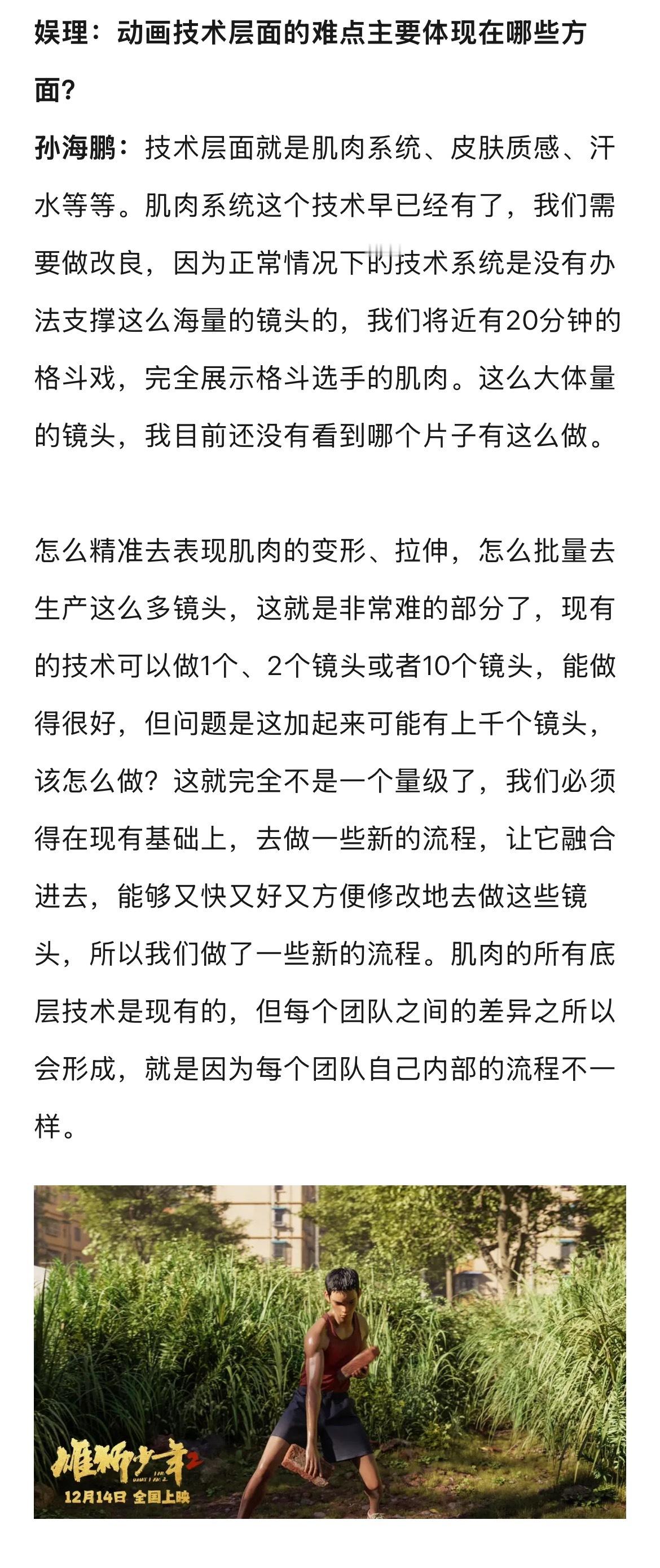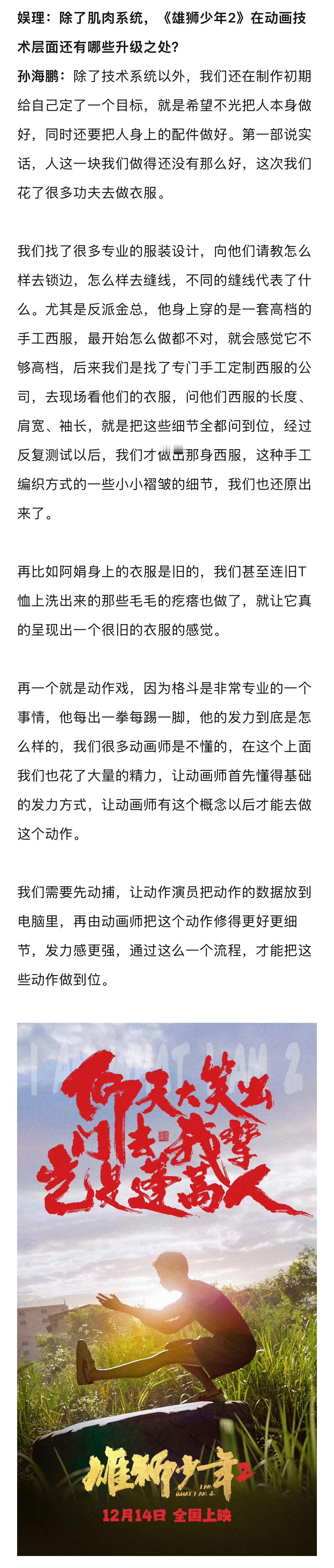 制作团队在《雄狮少年2》的剧情和技术方面进行了全面升级,其中有三场特别重要的格斗戏,后面做的时候才发觉有多难,“也正好是我们的一个机会。就是越少人做,我们的机会就越大,就越有可能在这里面去做出一些新意来,所以就是靠这个信念坚持下来了。”