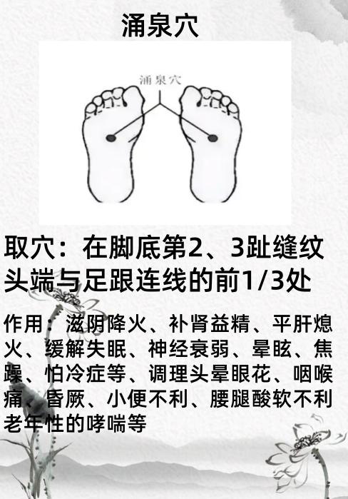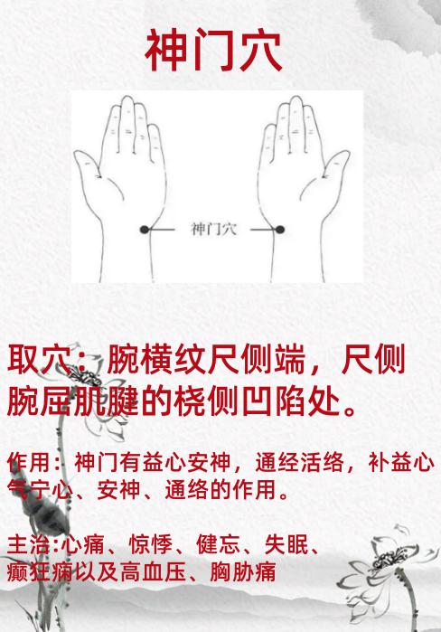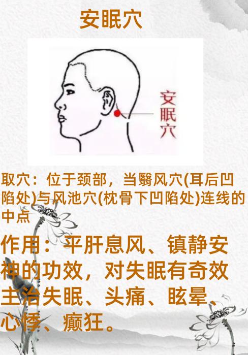晚上睡不着,这几个穴位到晚上揉一揉,快速入眠,改善睡眠。 神门穴,益心安神,通经活络,补益心气宁心、安神、通络的作用。主治:心痛、惊悸、健忘、失眠、癫狂痫以及高血压、胸胁痛。 安眠穴,平肝息风、镇静安神的功效,对失眠有奇效主治失眠、头痛、眩晕、心悸、癫狂。 太冲穴,疏肝理气,调节情绪是肝气郁结的排毒穴,易怒的人食物消气穴对有甲状腺结节、乳腺结节的人是个宝藏穴位。 涌泉穴,作用滋阴降火、补肾益精、平肝熄火,缓解失眠、神经衰弱、晕眩、焦躁、怕冷症等,调理头晕眼花、咽喉痛、昏厥、小便不利、腰腿酸软不利、老年性的哮喘等。