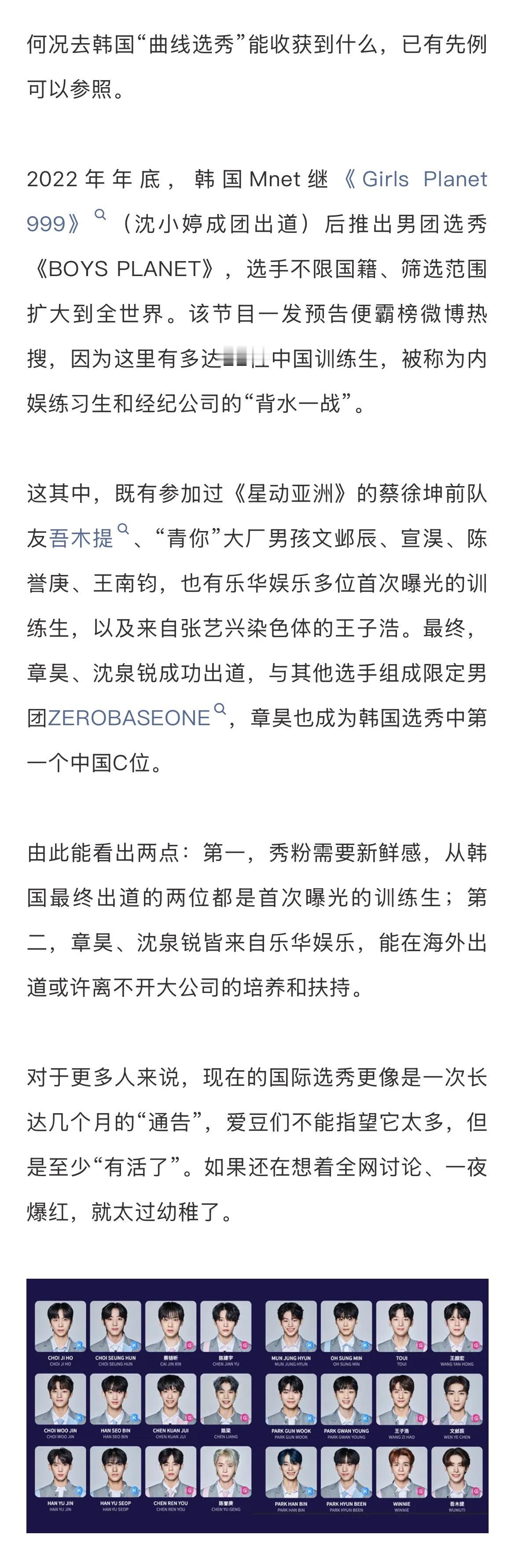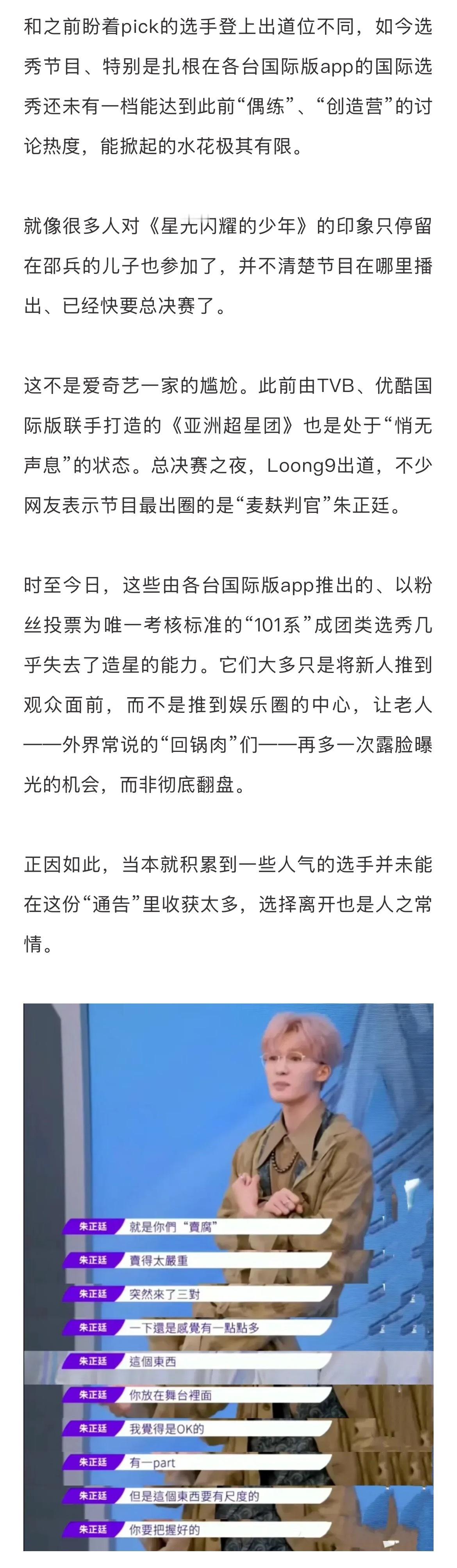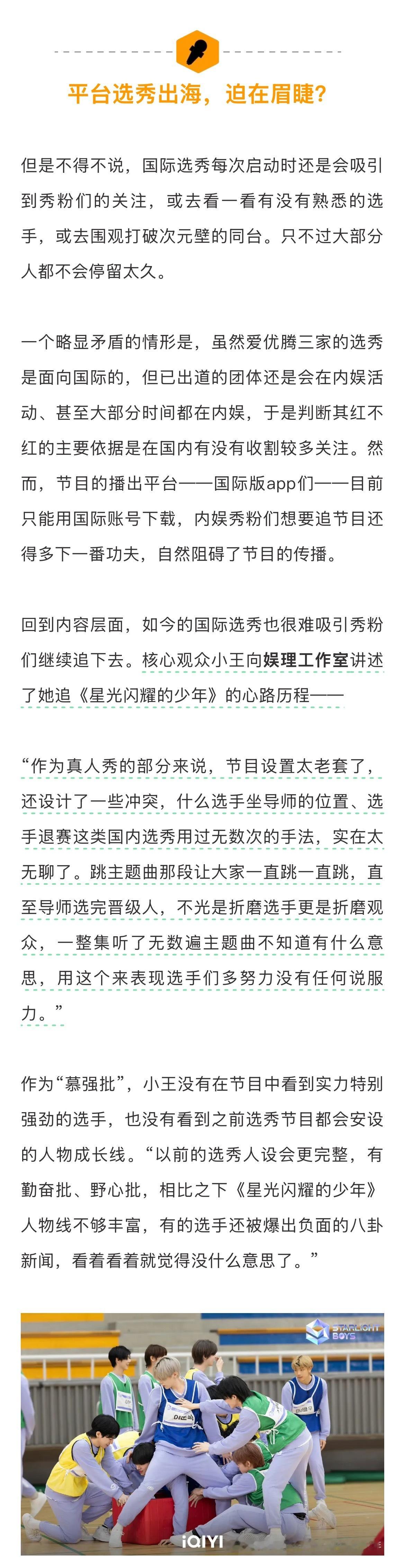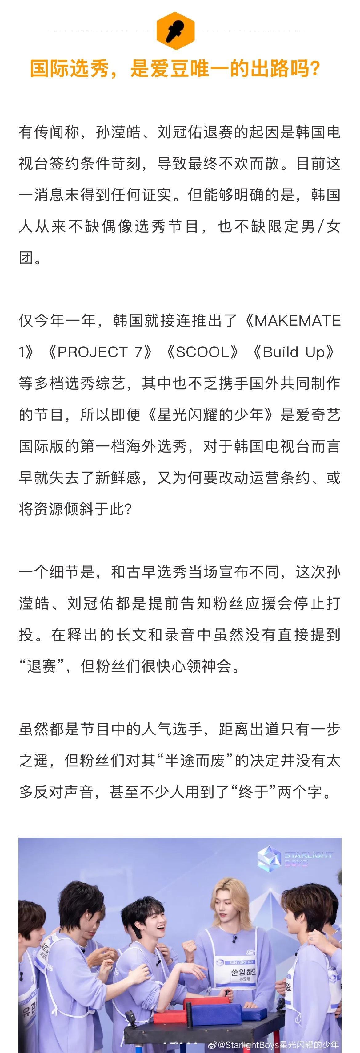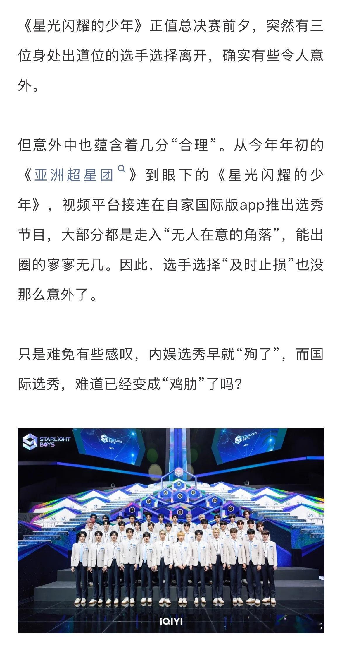 101系选秀失去造星能力了吗 谁还关心国际选秀 近日,由爱奇艺国际版与韩国SBS联合打造的全球男团选秀《星光闪耀的少年》(Starlight Boys)迎来“退赛潮”:曾在《青春有你3》出道的孙滢皓、刘冠佑,以及凭借出演短剧收获不少人气的张集峻同时宣布退赛。