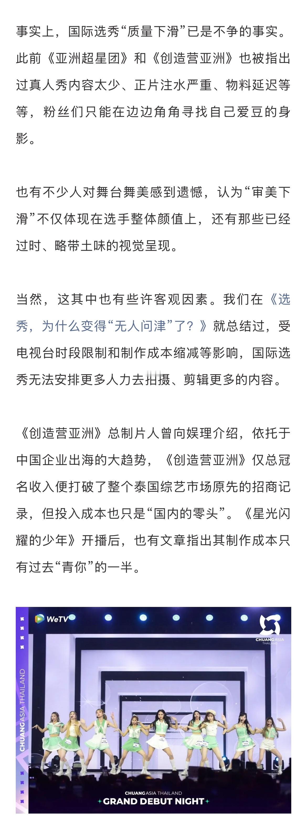 在娱理工作室看来,国际选秀“质量下滑”已是不争的事实。此前《亚洲超星团》和《创造营亚洲》也被指出过真人秀内容太少、正片注水严重、物料延迟等等,粉丝们只能在边边角角寻找自己爱豆的身影。也有不少人对舞台舞美感到遗憾,认为“审美下滑”不仅体现在选手整体颜值上,还有那些已经过时、略带土味的视觉呈现。更多内容请看 娱理锐评 ↓