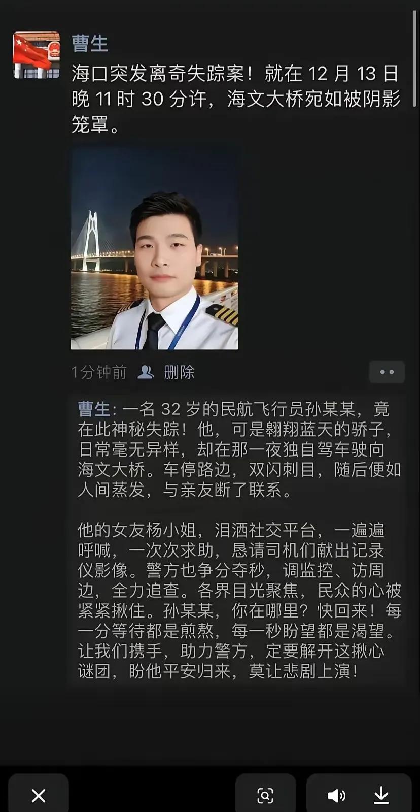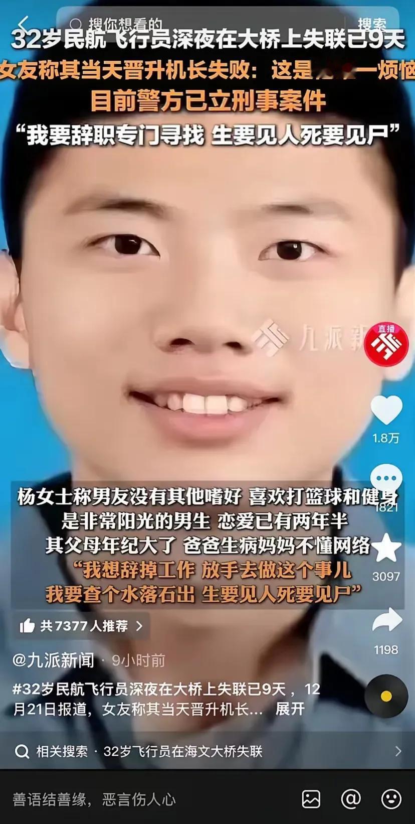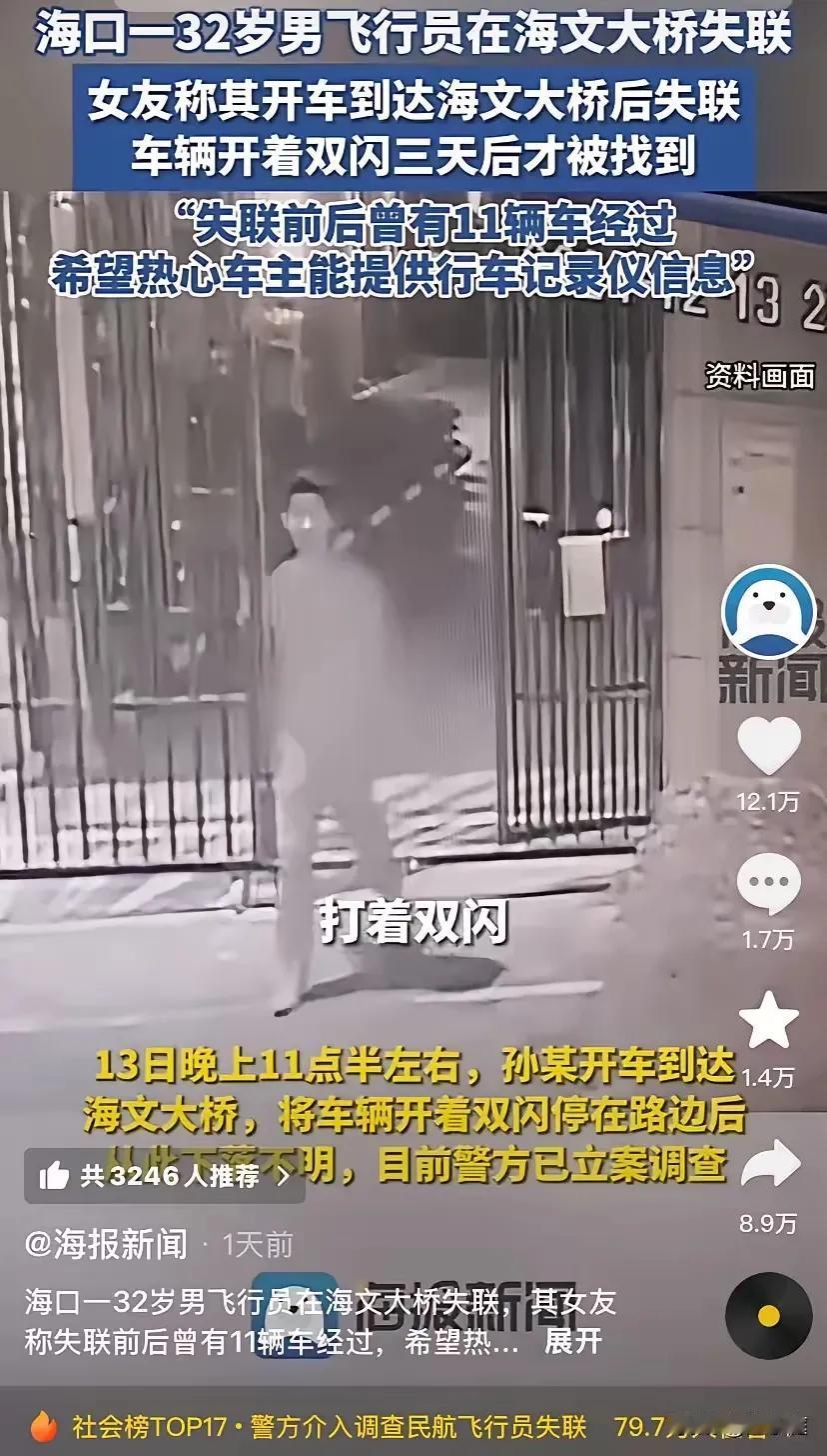 32岁副机长离奇失踪, 车子在大桥打双闪,人不知道去哪了! 相信这是大家在这两天看到最为惊讶的事件, 而女友的每一次的发声,都似乎把这名飞行员推向了只有一种可能,那就是轻生,因为不可能会平白无故的消失!