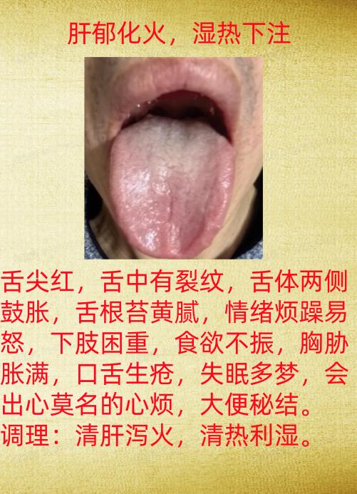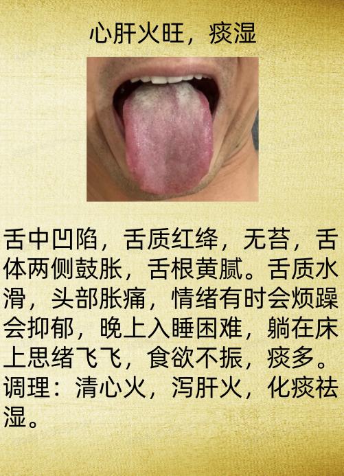 朋友们,大家好啊,我是中医张佩江,今天是舌诊挑战24天。 最近看舌头的朋友,越来越多了。挑战一天看85个舌象! 你拍舌像,我来分析,为每个拍舌象的朋友解惑, 今天的舌象案例分享。 脾虚湿盛,心肝火旺:舌体胖大,舌尖红有裂纹,舌中有裂纹,白苔腻,舌体两侧鼓胀有裂纹。 肝郁化火,湿热下注:舌尖红,舌中有裂纹,舌体两侧鼓胀,舌根苔黄腻。 心肝火旺,痰湿:舌中凹陷,舌质红绛,无苔,舌体两侧鼓胀,舌根黄腻。舌质水滑。
