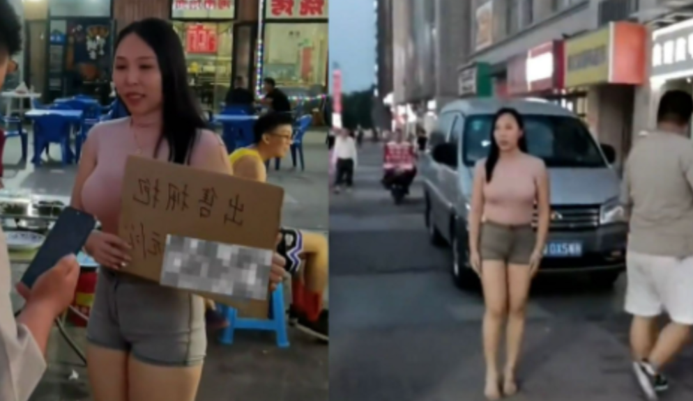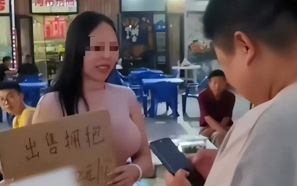更令人咋舌的是,她竟然高举着一个纸板,上面歪歪扭扭地写着:"拥抱,2元一次!"