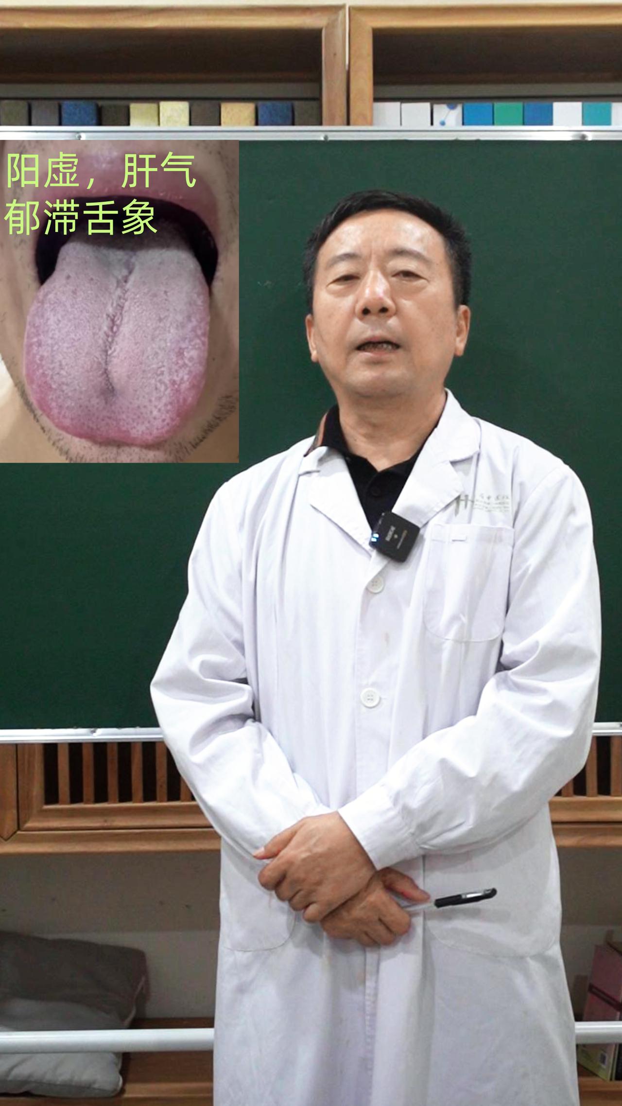 朋友们,大家好啊,今天是舌诊挑战26天。 最近看舌头的朋友,越来越多了。挑战一天看80个舌象! 你拍我看,一张舌象照片,为每个拍舌象的朋友解惑! 今天和大家分享一则,肾阳虚,肝气郁结的舌象。 这个舌象第一眼看到的是舌体胖大,这说明体内有湿。 舌体两侧,鼓胀,发红,有斑点一直延伸到舌尖,这说明不止有气滞,还有血瘀。 舌尖红,也有斑点,说明肝郁化热,导致的心火旺盛。 舌前中凹陷,裂纹一直延伸到舌根,说明存在脾虚的情况。 舌根白腻,说明肾阳虚,肾不能调节全身的水液。