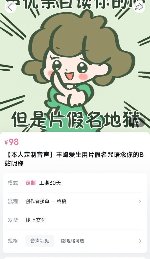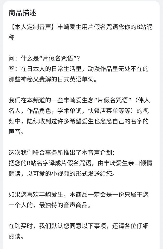 声优「丰崎爱生」在B站开设了「本人定制音声」服务 - 丰崎爱生用片假名咒语念你的B站昵称”,定价98元人民币。 丰崎爱生定制音声服务