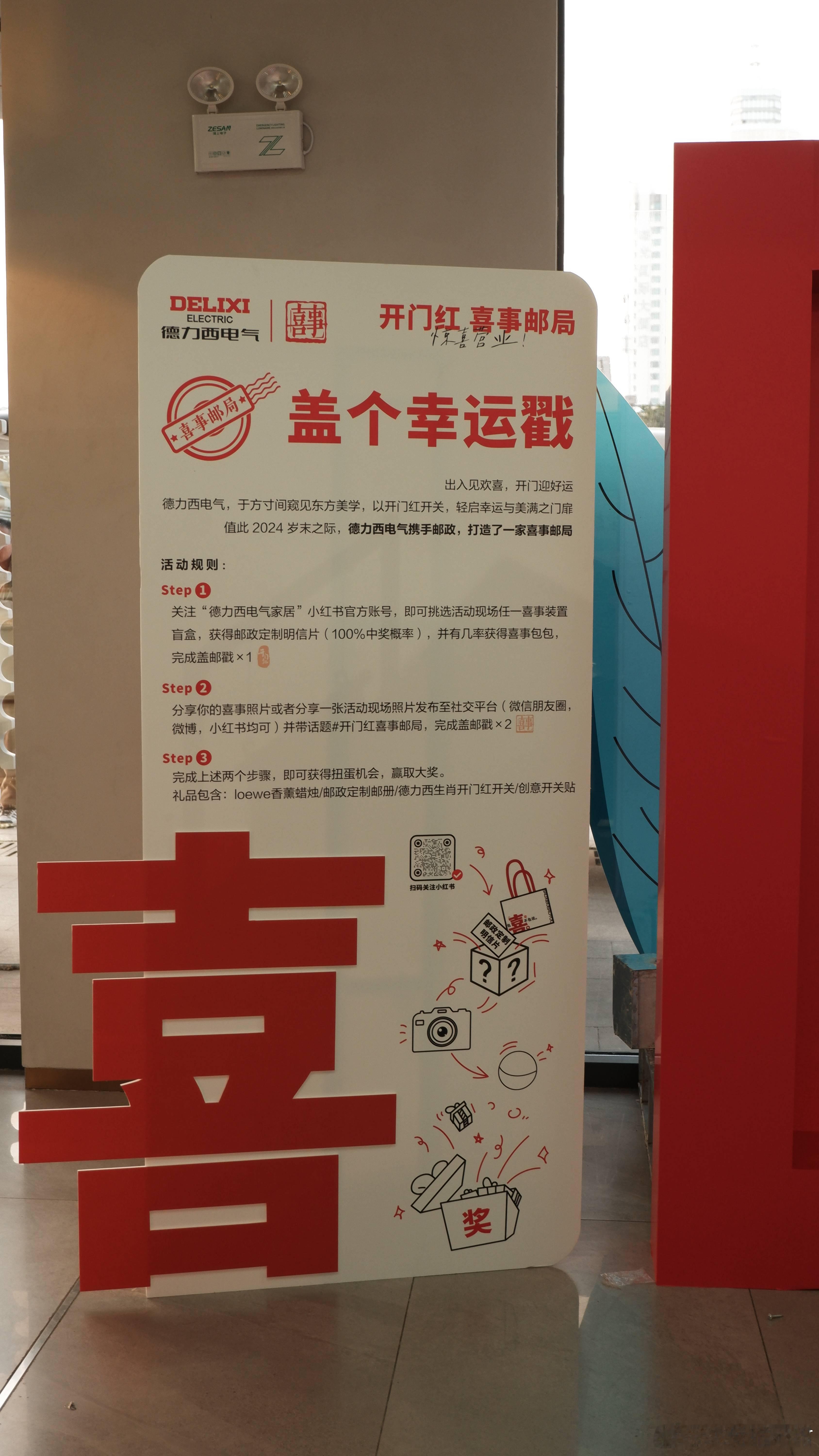 新年就要开门红 🎉💌 临近跨年啦!在家DIY了个好运开关,贴上大红福字,一按就是满满的好运!贴上后按下这个“开门红”按钮,愿家人健康,工作顺利,好运连连~ 南京还有德力西电气和邮政联名的喜事邮局,巨型邮筒好喜欢啊~也迫不及待来打卡啦,希望大家也好运连连~
