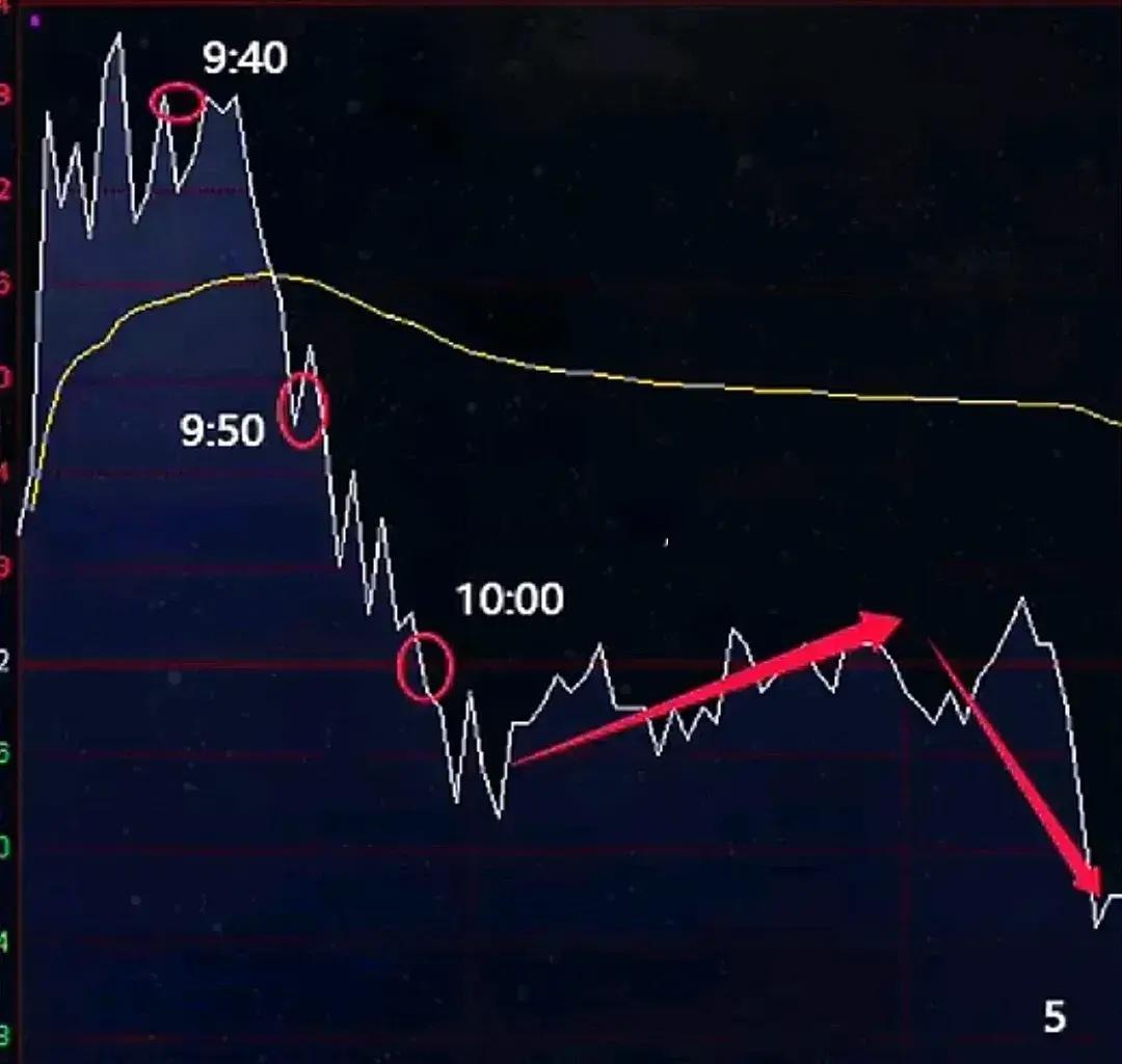 5. 一高两低跌破均价线:行情大概率持续下跌,跌破第三个时间点价格,第二天低开可能性大。例如9:40股价较高,9:50和10:00股价较低且跌破均价线,预示股价将继续下行。