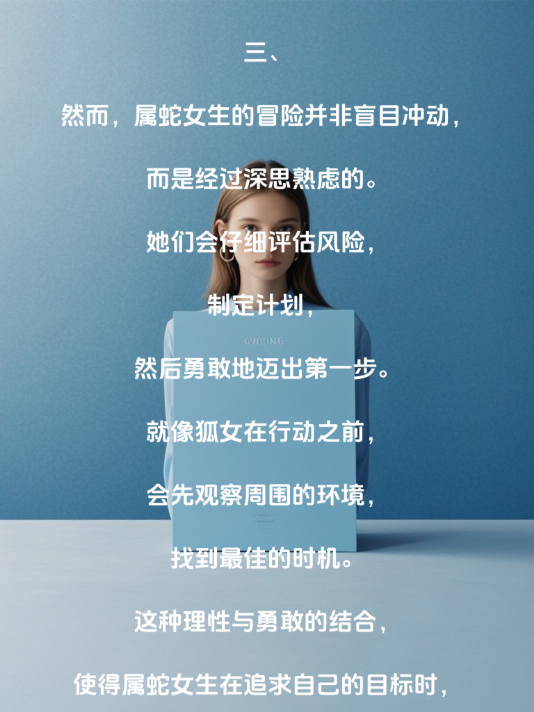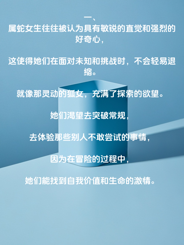一、属蛇女生往往被认为具有敏锐的直觉和强烈的好奇心,这使得她们在面对未知和挑战时,不会轻易退缩。就像那灵动的狐女,充满了探索的欲望。她们渴望去突破常规,去体验那些别人不敢尝试的事情,因为在冒险的过程中,她们能找到自我价值和生命的激情。 二、这种对冒险的热爱,源于属蛇女生内心深处的勇敢和坚韧。她们不畏惧困难和挫折,而是将其视为成长的机遇。就如同狐女在追逐猎物时,虽会遇到各种阻碍,但始终坚持不懈。她们相信,只有通过冒险,才能打开通往未知世界的大门,发现那些隐藏在深处的美好。 三、然而,属蛇女生的冒险并非盲目冲动,而是经过深思熟虑的。她们会仔细评估风险,制定计划,然后勇敢地迈出第一步。就像狐女在行动之前,会先观察周围的环境,找到最佳的时机。这种理性与勇敢的结合,使得属蛇女生在追求自己的目标时,能够更加坚定和自信,也让她们在爱情的道路上,散发出独特的魅力。
