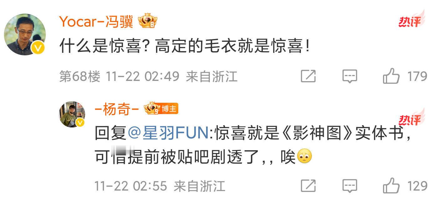 【杨奇回应《黑神话》年底惊喜:就是B站的跨年晚会】之前“冯骥”在金摇杆“终极年度游戏”获奖致辞中说“年底有惊喜”,那几日“杨奇”回复网友时曾表示惊喜就是《影神图》实体书。 黑神话悟空