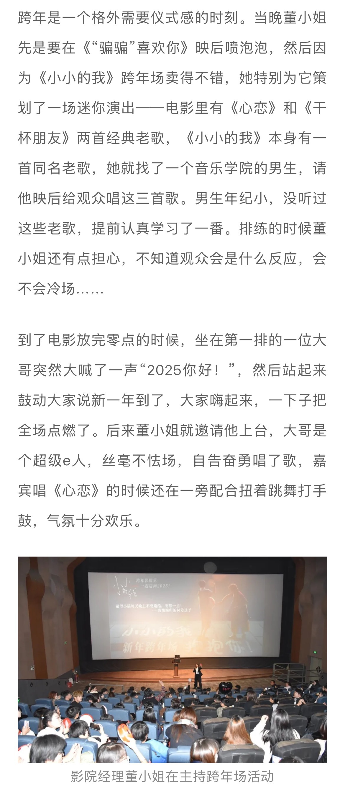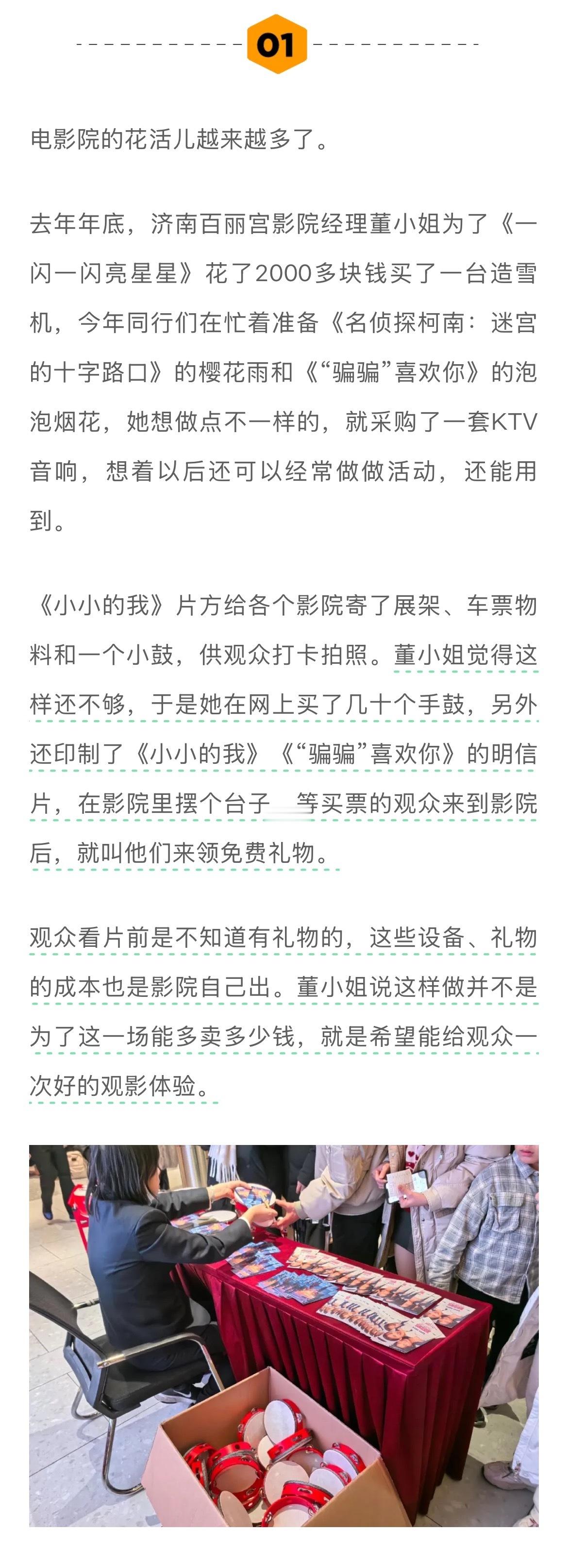影院经理看好小小的我走长线 电影票降价了你会去看电影吗 最近电影宣发和影院纷纷挖空心思营造仪式感、整活儿,包括新片降票价现象,背后都透出一个令人无奈的事实:如今的电影想靠内容本身来吸引观众确实已经很难了,所以必须大力创新,让电影院能重新成为年轻人喜欢的社交+打卡场所。即便这样会带来很多额外的工作量…