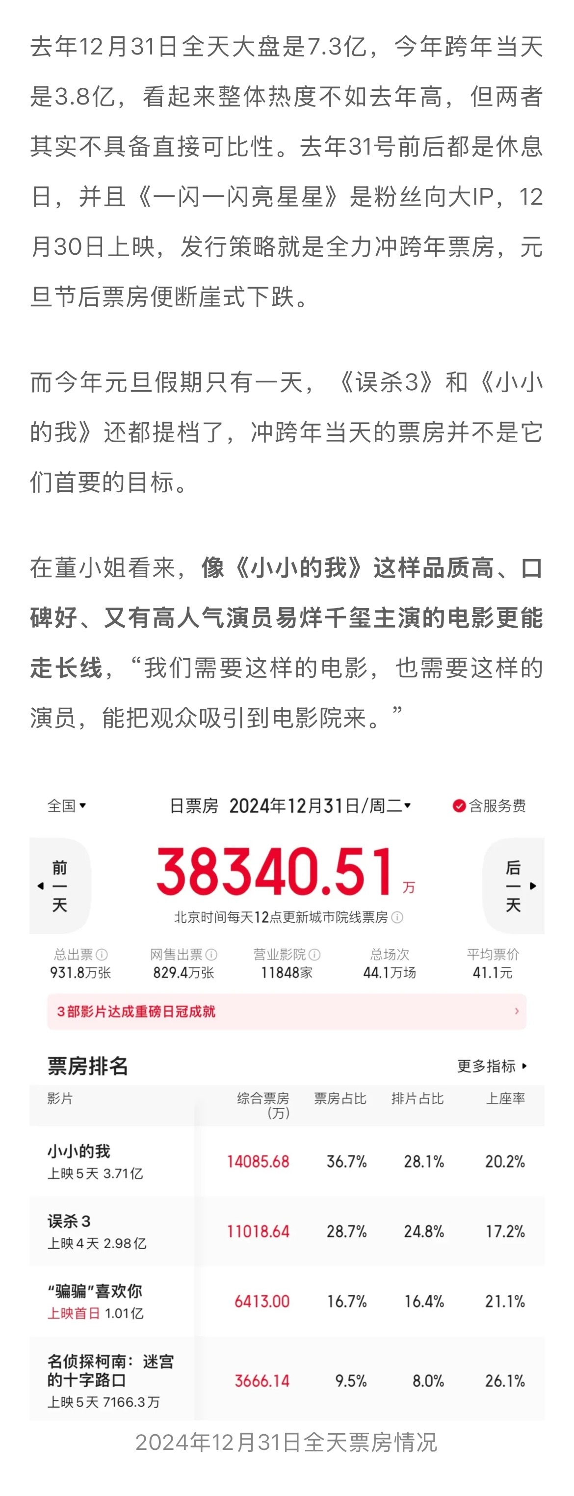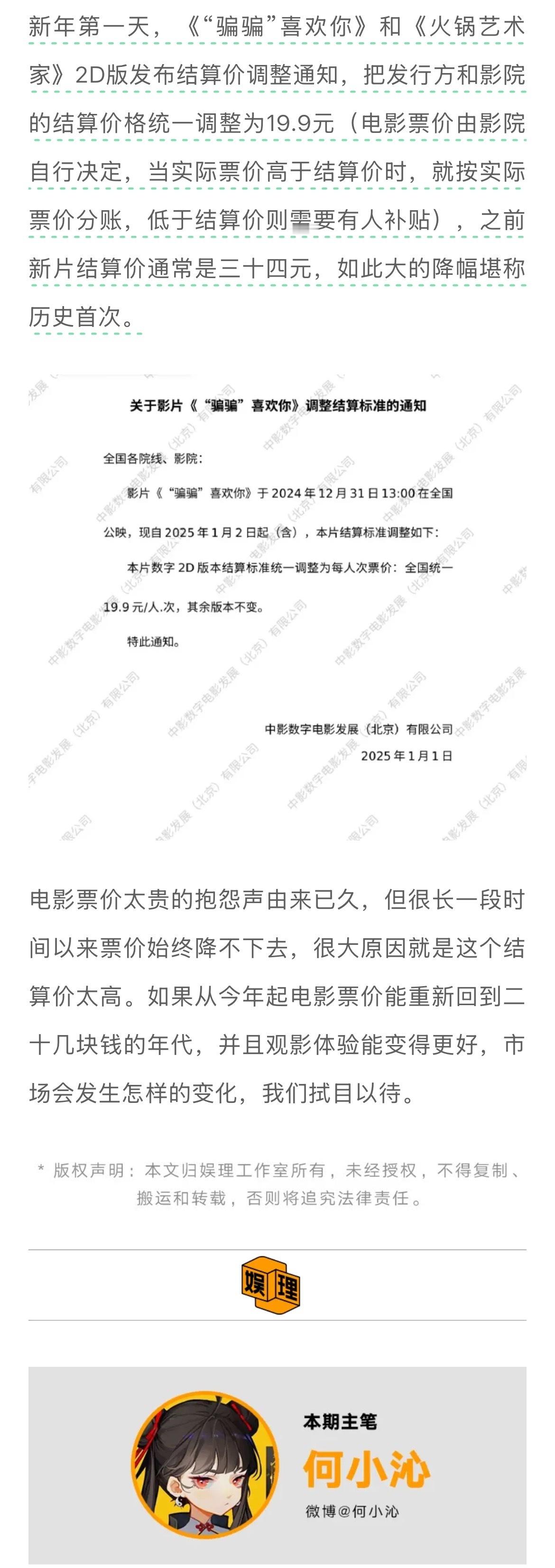 此外在新年第一天,《“骗骗”喜欢你》和《火锅艺术家》2D版发布结算价调整通知,把发行方和影院的结算价格统一调整为19.9元(电影票价由影院自行决定,当实际票价高于结算价时,就按实际票价分账,低于结算价则需要有人补贴),之前新片结算价通常是三十四元,如此大的降幅堪称历史首次。