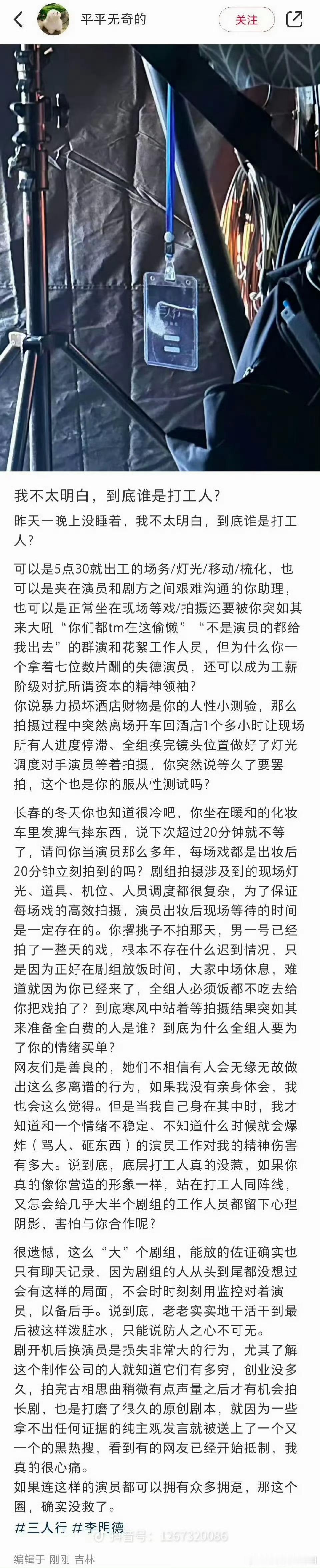 二搭李明德的曾宥臻,鸣龙少年里的边晓晓,这次《三人行》是二搭,也站剧组工作人员的发文。现在在抖上只要不站李明德,不管你是多普通的打工人,还是比他还糊得不能再糊的小演员,都会被打成“阶级”