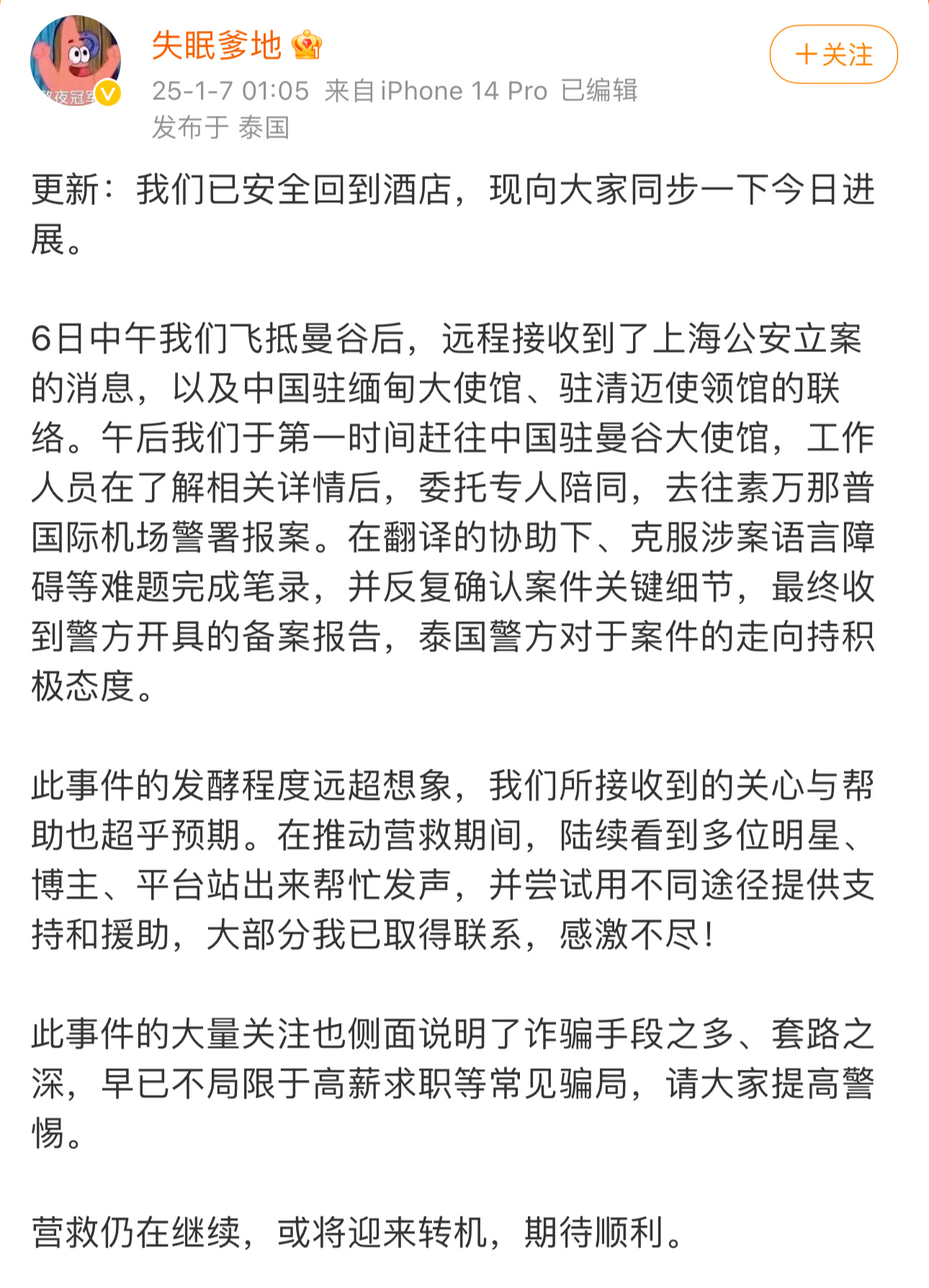 演员王星女友更新最新情况 泰国三大电视台之一的泰国七台昨晚也发推了:找到了星星,一位神秘失踪的中国演员,现在在缅甸,很安全,明天将送回泰国