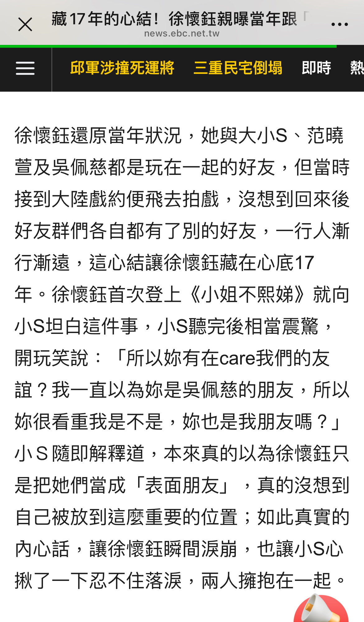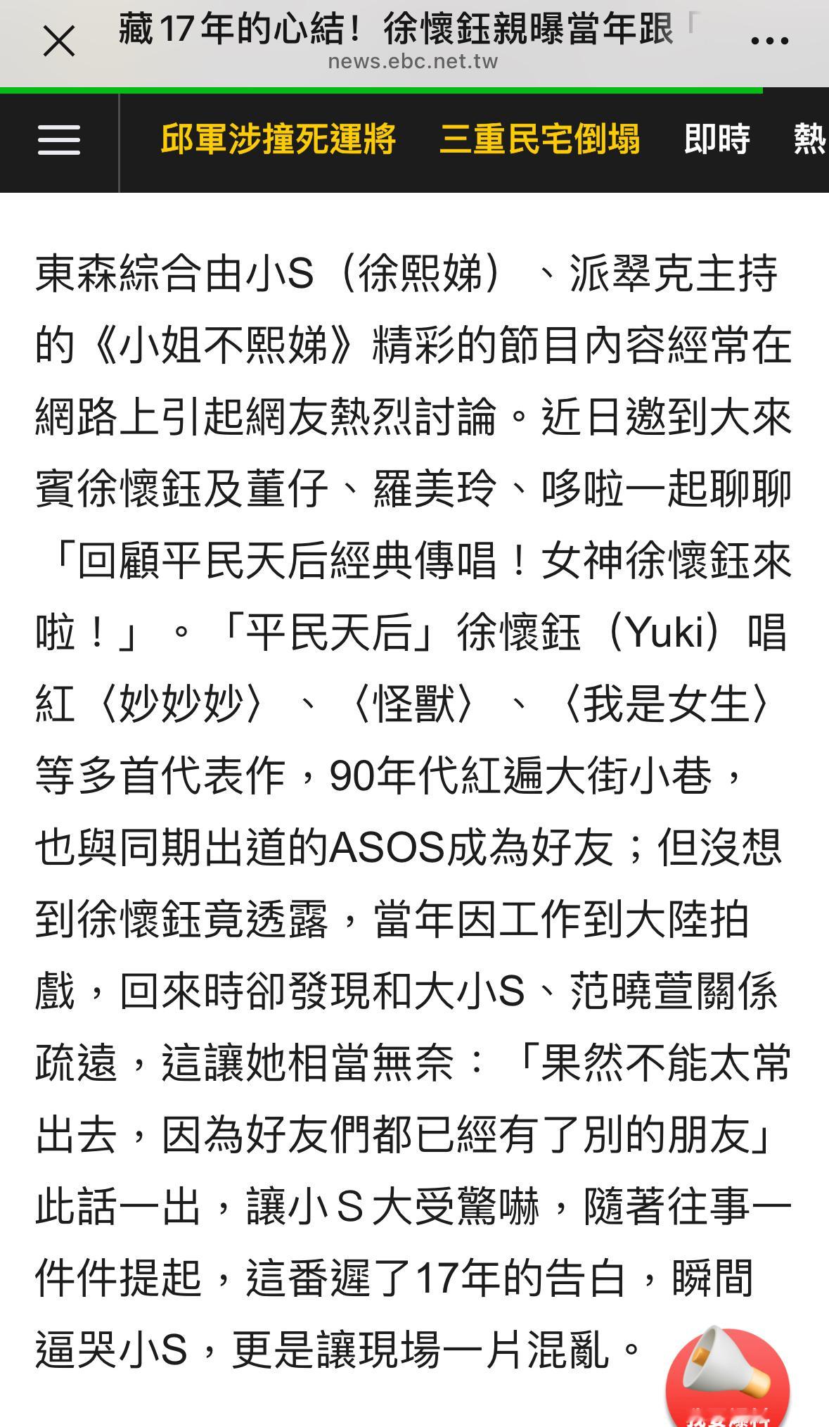 徐怀钰说;当年她与大小S、范晓萱及吴佩慈都是玩在一起的好友,但当时接到大陆戏约便飞去拍戏,没想到回来后好友群们各自都有了别的好友,一行人渐行渐远,这心结让徐怀钰藏在心底17年。