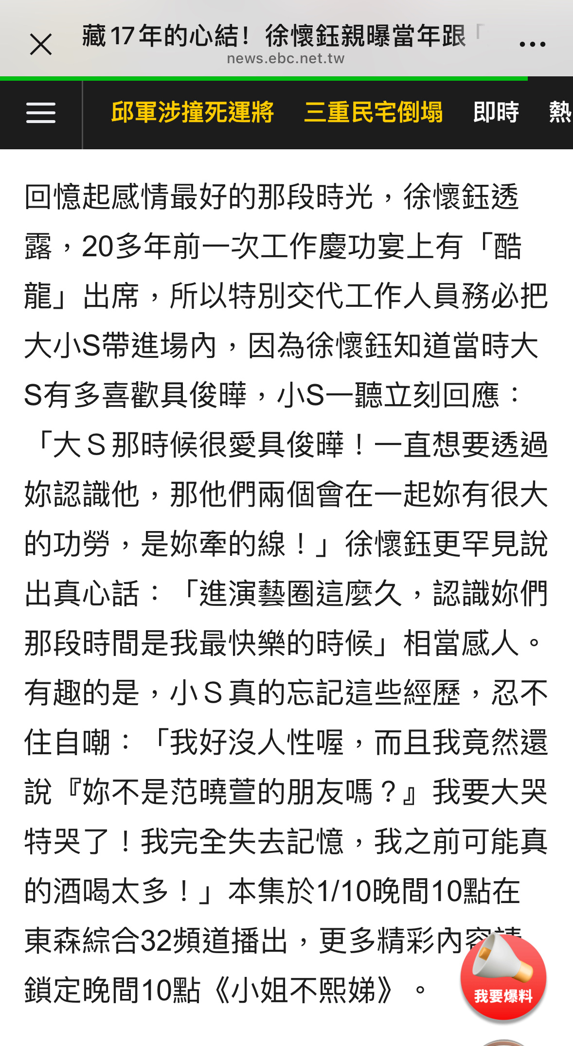 徐怀钰透露,20多年前一次工作庆功宴上有酷龙具俊晔出席,所以特别交代工作人员务必把大小S带进场内,因为徐怀钰知道当时大S有多喜欢具俊晔,小S一听立刻回应:“大S那时候很爱具俊晔!一直想要透过你认识他,那他们两个会在一起你有很大的功劳,是你牵的线!”