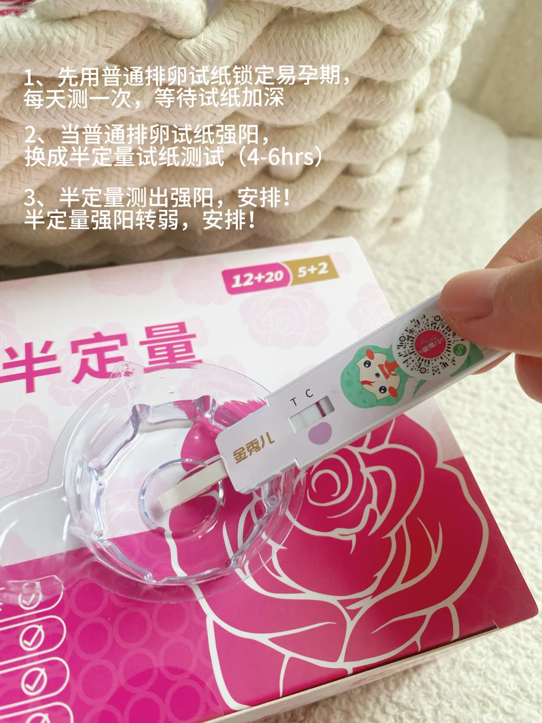 当然还是要有科学的辅助工具帮忙,才能事半功倍,用金秀儿半定量排卵试纸套装,能够区分出排卵前后,它是5miu/ml灵敏度,可以检测到排卵激素高峰期,锁定受孕黄金24小时,大大的提高了成功怀孕的概率