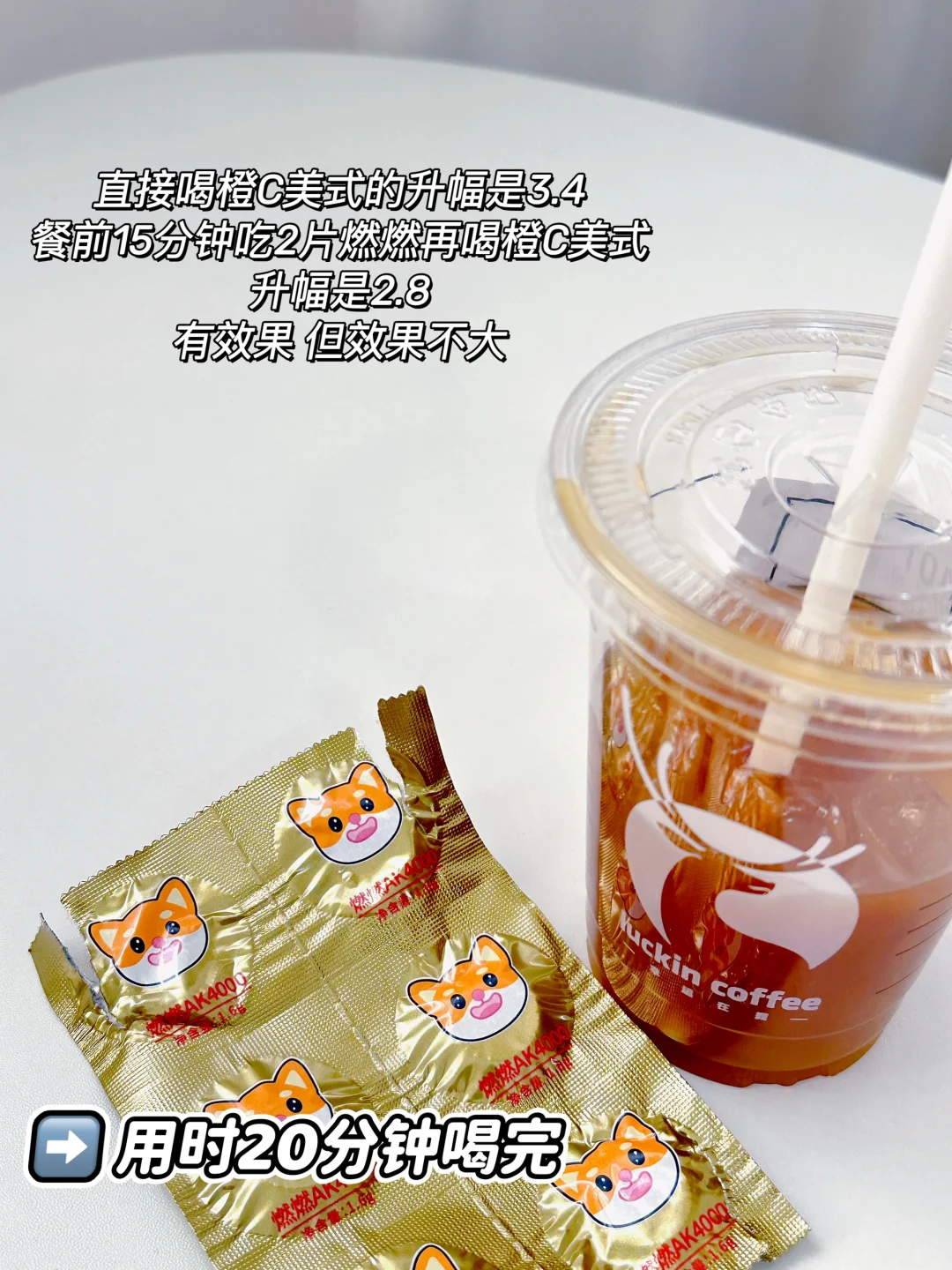 直接喝橙C美式的升幅是3.4,餐前15分钟吃2片燃燃再喝橙C美式升幅是2.8,有效果,但效果不大[doge]