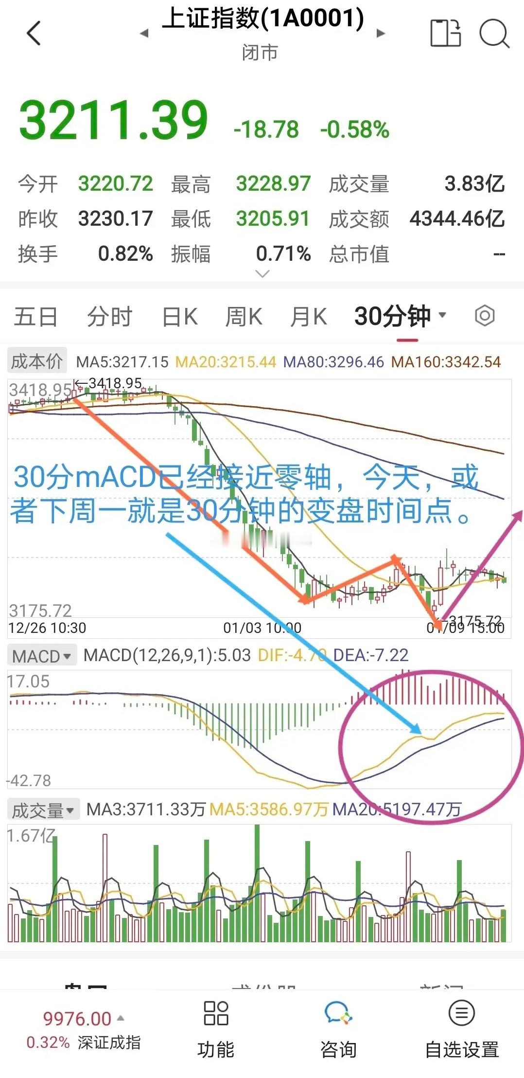 昨天的《上证早知道》说过,5分钟的中枢震荡的目的就是为了让30分钟MACD回归零轴,那么经过昨天一整天的强势震荡,30分钟MACD至昨天下午收盘时,已经如约来到了零轴跟前。也就是说5分钟的震荡行情,任务已经完成的差不多了。那么接下来就是30分钟的变盘时间了,快的话就在今天,最迟下周一,30分钟MACD要么继续向上爬上零轴,要么选择零下死叉,重新远离零轴。