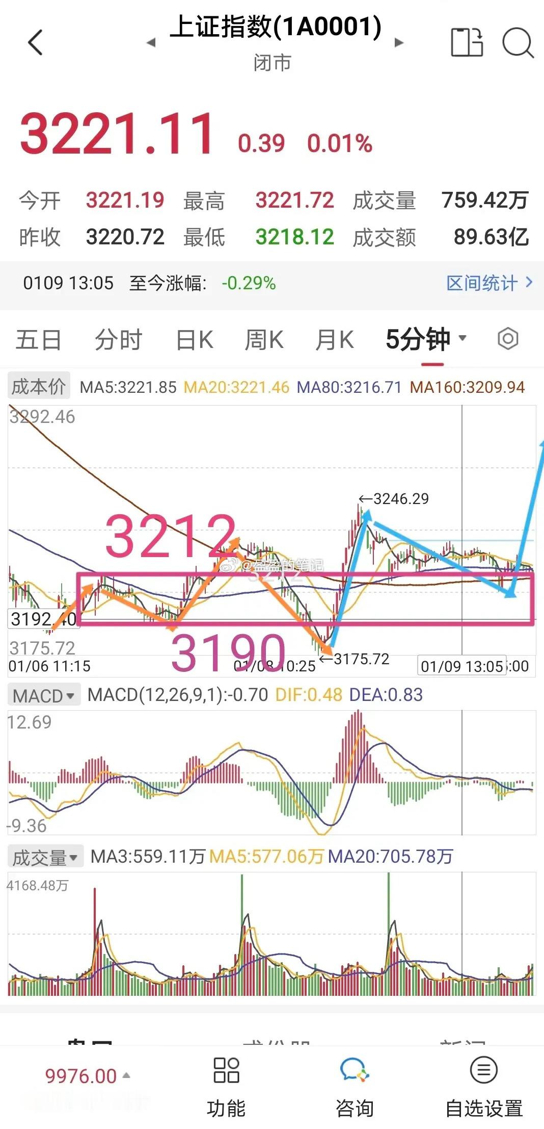 上证指数昨天跌0.58%,收盘3211.39,刚刚收在5分钟的震荡中枢上沿3212处,没有出现三买,还是5分钟中枢震荡走势。