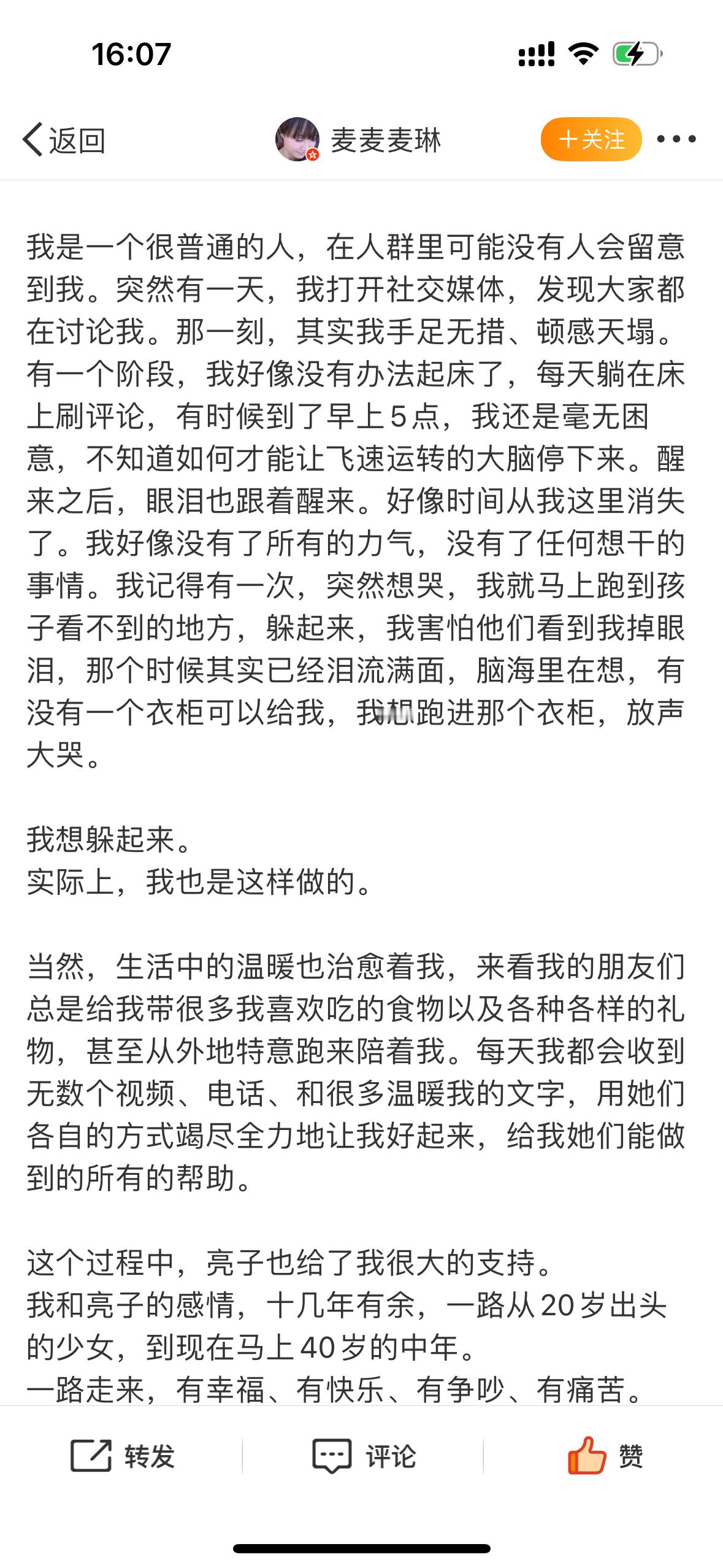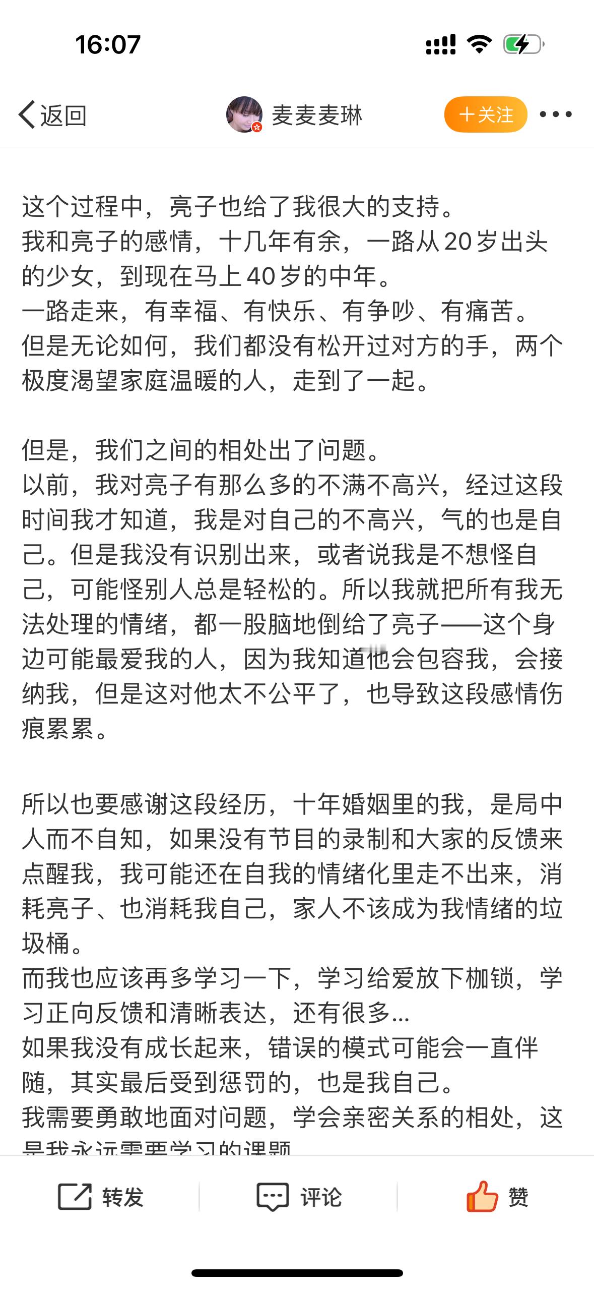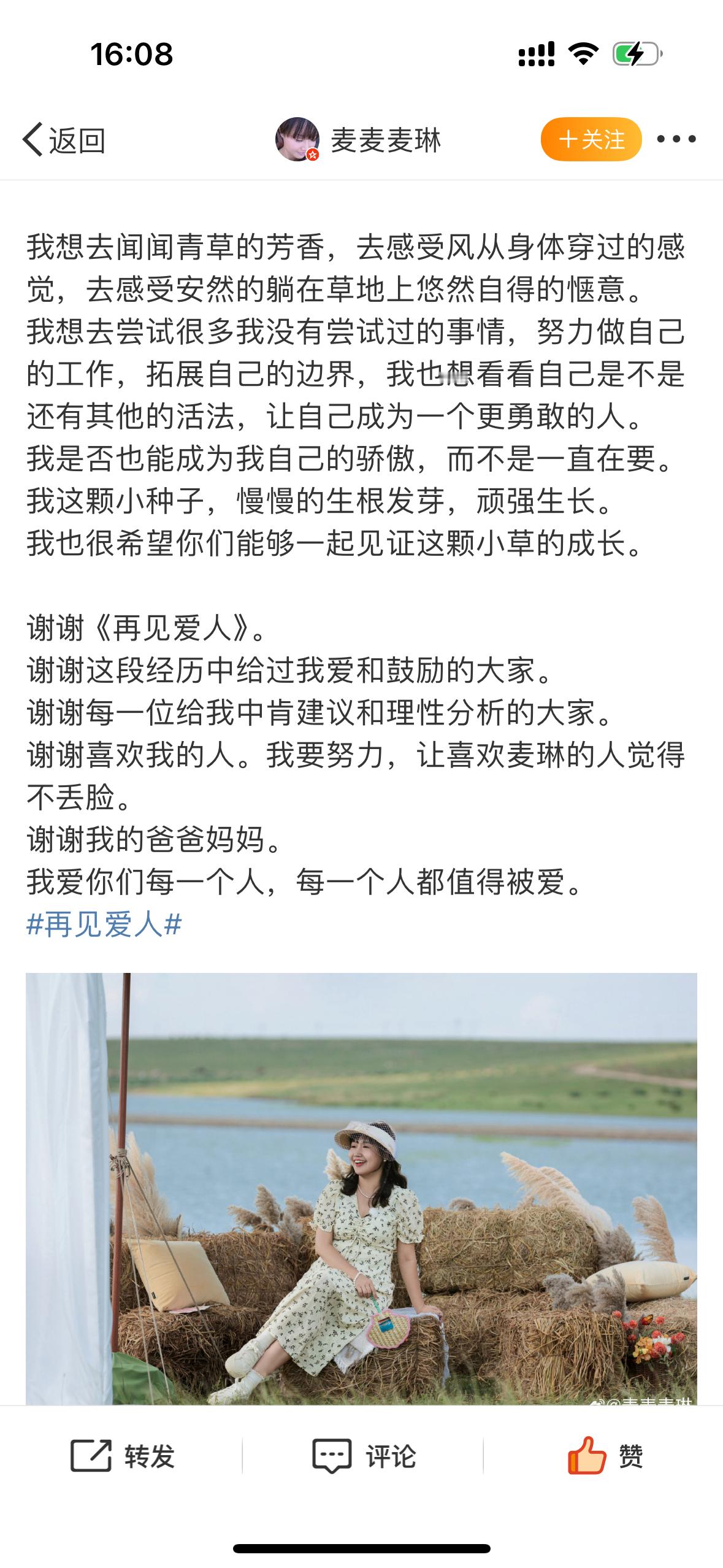 麦琳发文告别再见爱人