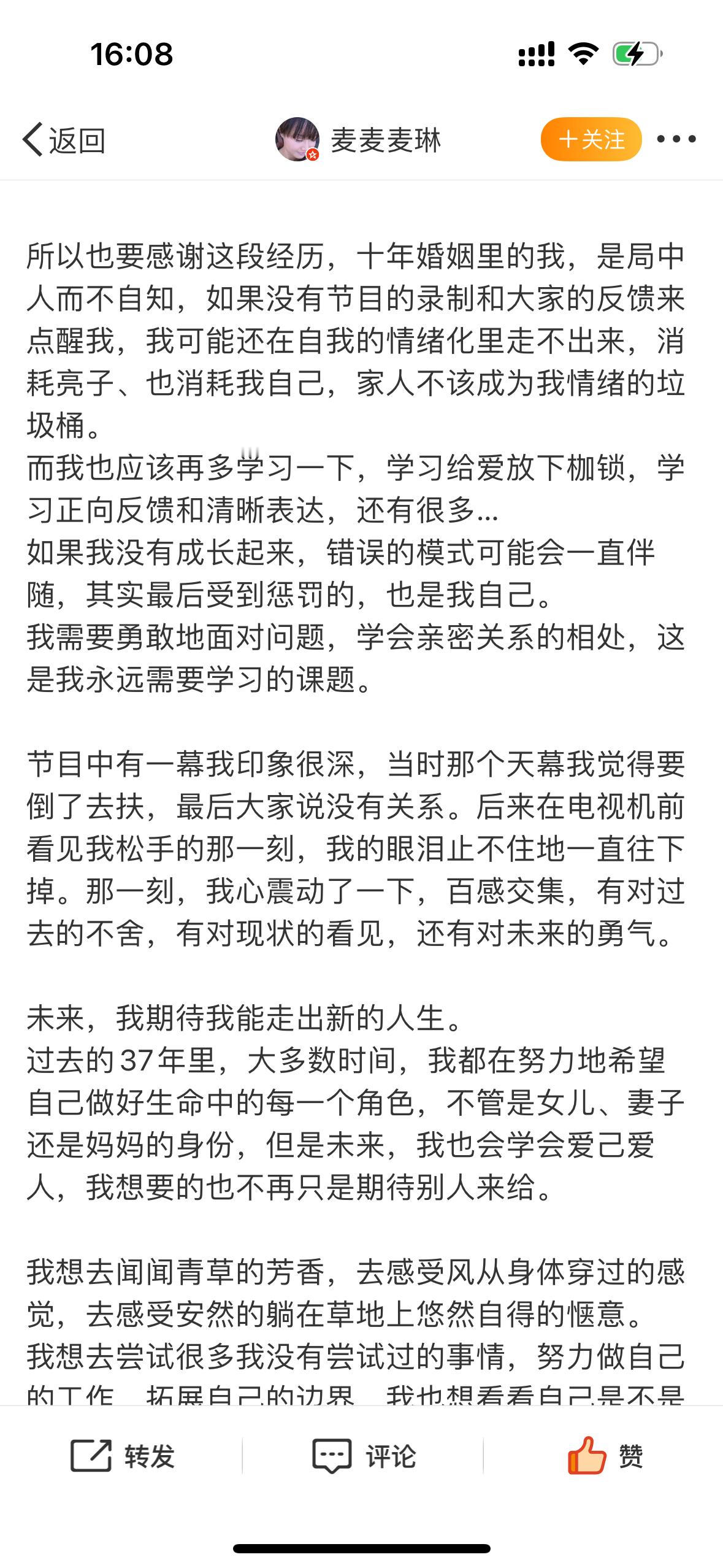 “过去的37年里,大多数时间,我都在努力地希望自己做好生命中的每一个角色,不管是女儿、妻子还是妈妈的身份,但是未来,我也会学会爱己爱人,我想要的也不再只是期待别人来给。 ”