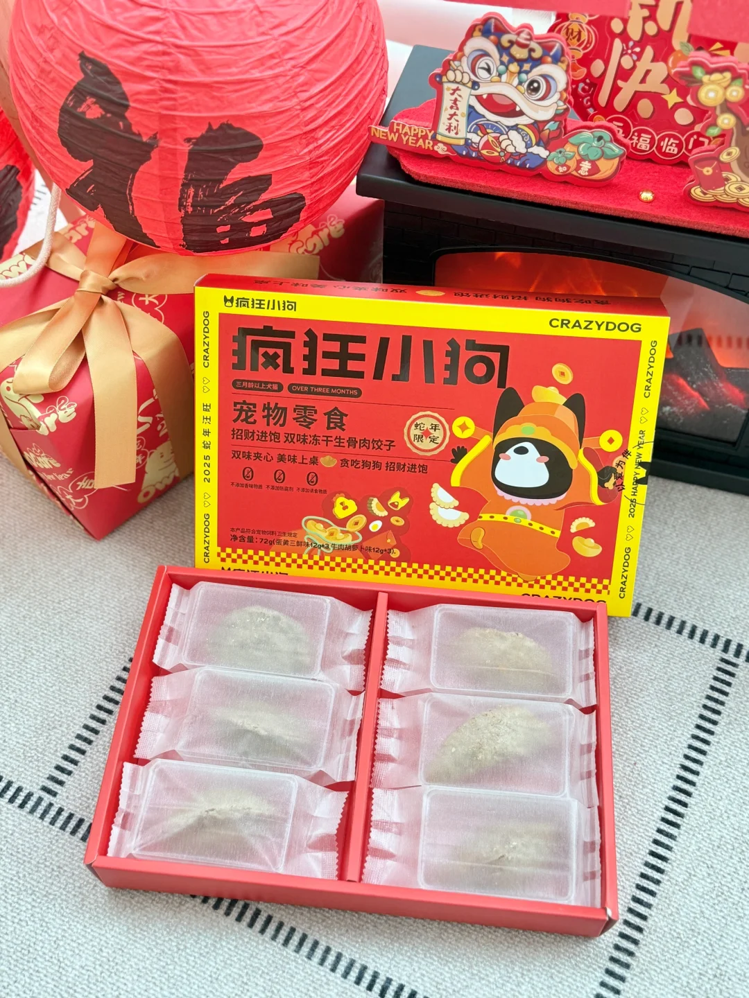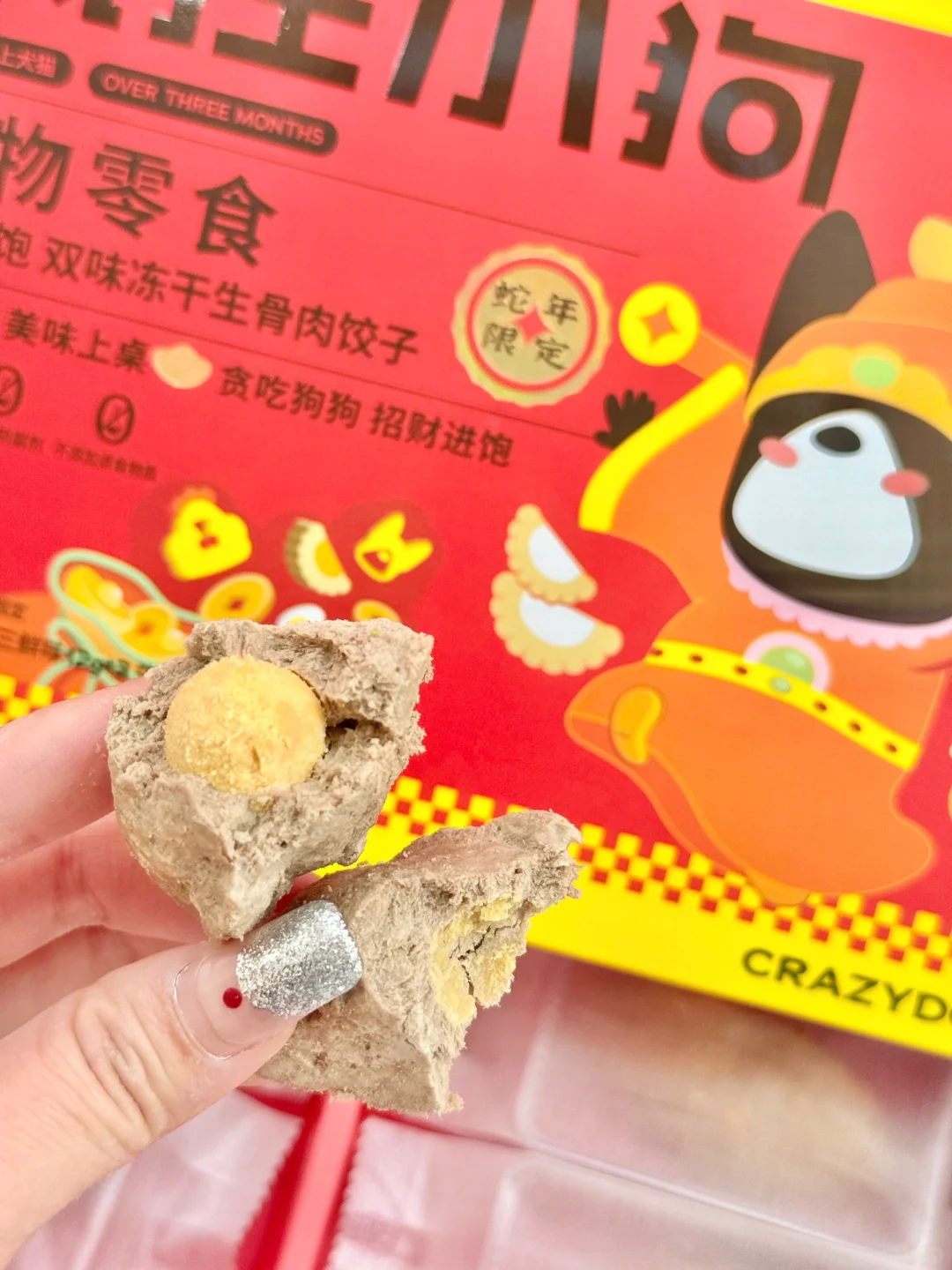 新年限定是快乐!看这小饺子形状,真的太可爱了,仪式感拉满! rich的第二个新年,去年过年也是吃疯狂小狗双拼冻干饺子,rich很爱吃!而且肠胃很适应,今年继续安排! 一盒有两个味道,蛋黄三鲜和牛肉胡萝卜,每个小水饺都是独立包装的,很卫生,回家过年也很方便带哦! 蛋黄的掰开可以看到整颗鹌鹑蛋黄,看着就很香!牛肉的也是肉眼可见的萝卜颗粒,完全是美味与健康并存! 今年rich的小狗年夜饭又有着落了!