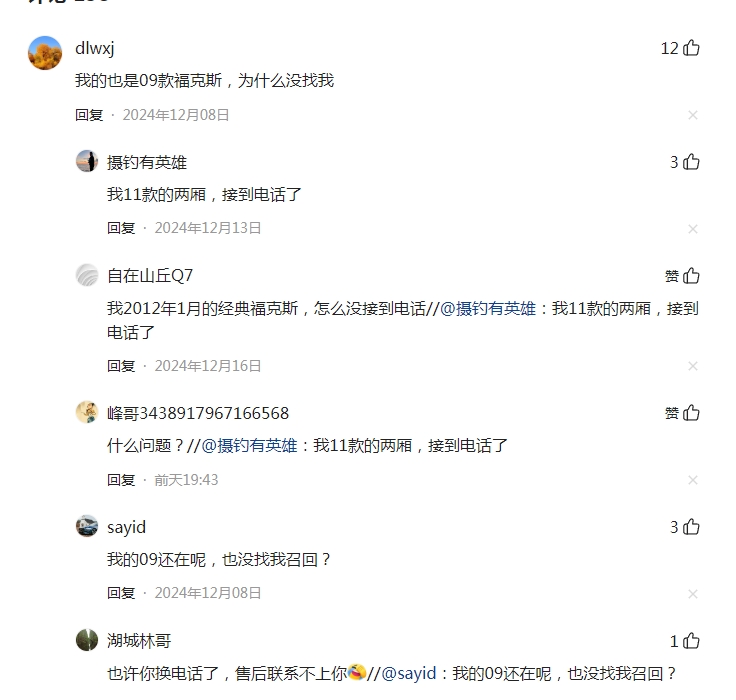 长安福特居然召回了十五年前的老福克斯。 一个朋友接到长安福特的电话,问他的车是不是还在开。要是还开的话,希望将车辆送回厂家去,会将刹车踏板衬套给更换一下,还顺便换了个自动油壶。 这可是15年以前的老车型,长安福特居然仍然没有放弃对他的关注,不知道其他车企能不能达到这样的地步? 我问了一下,接到电话的人确实有不少。比如11款的两厢福克斯也接到了电话,还有福克斯三厢1.8mt也接到了。