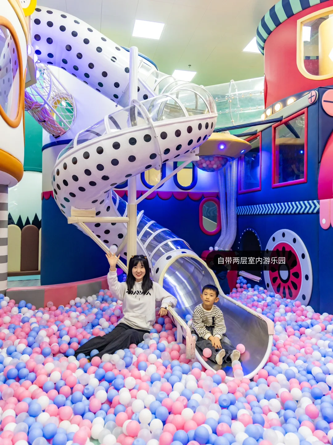 主楼内还有一个两层的室内游乐园,有滑梯、海洋球、厨房、超市玩具等,全时段开放