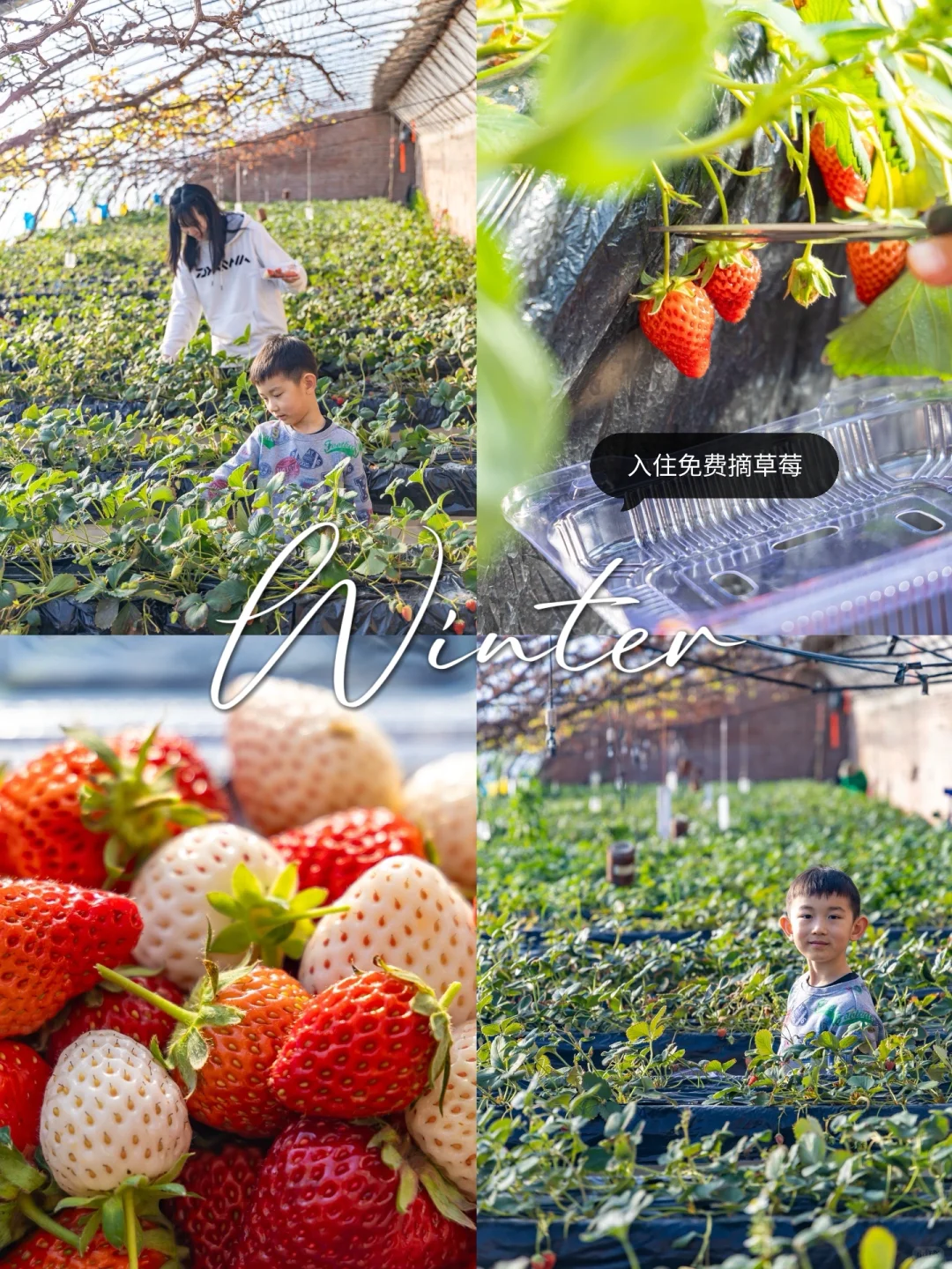 冬季限定‼️可以在大棚体验采摘新鲜的草莓,有红颜还有白草莓,入住可以免费摘一斤