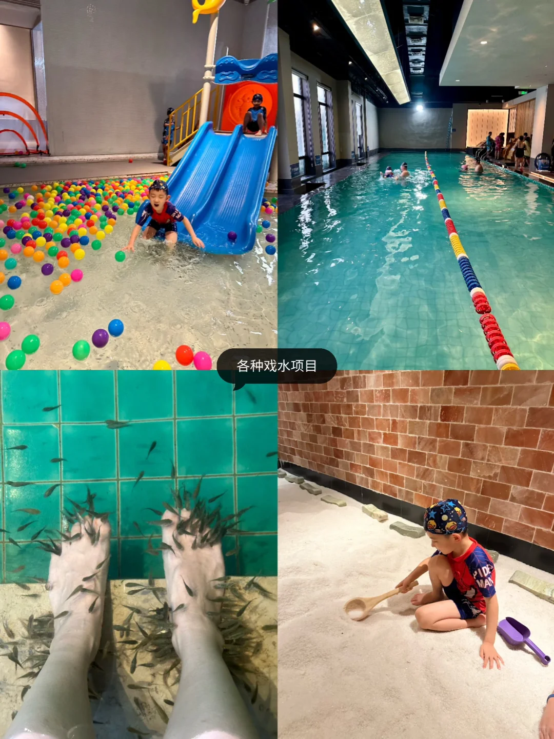 有室内和室外汤泉,以及室内游泳池。戏水池还有滑梯、海洋球。足底亲亲鱼也很好玩。有汗蒸,也有休息大厅