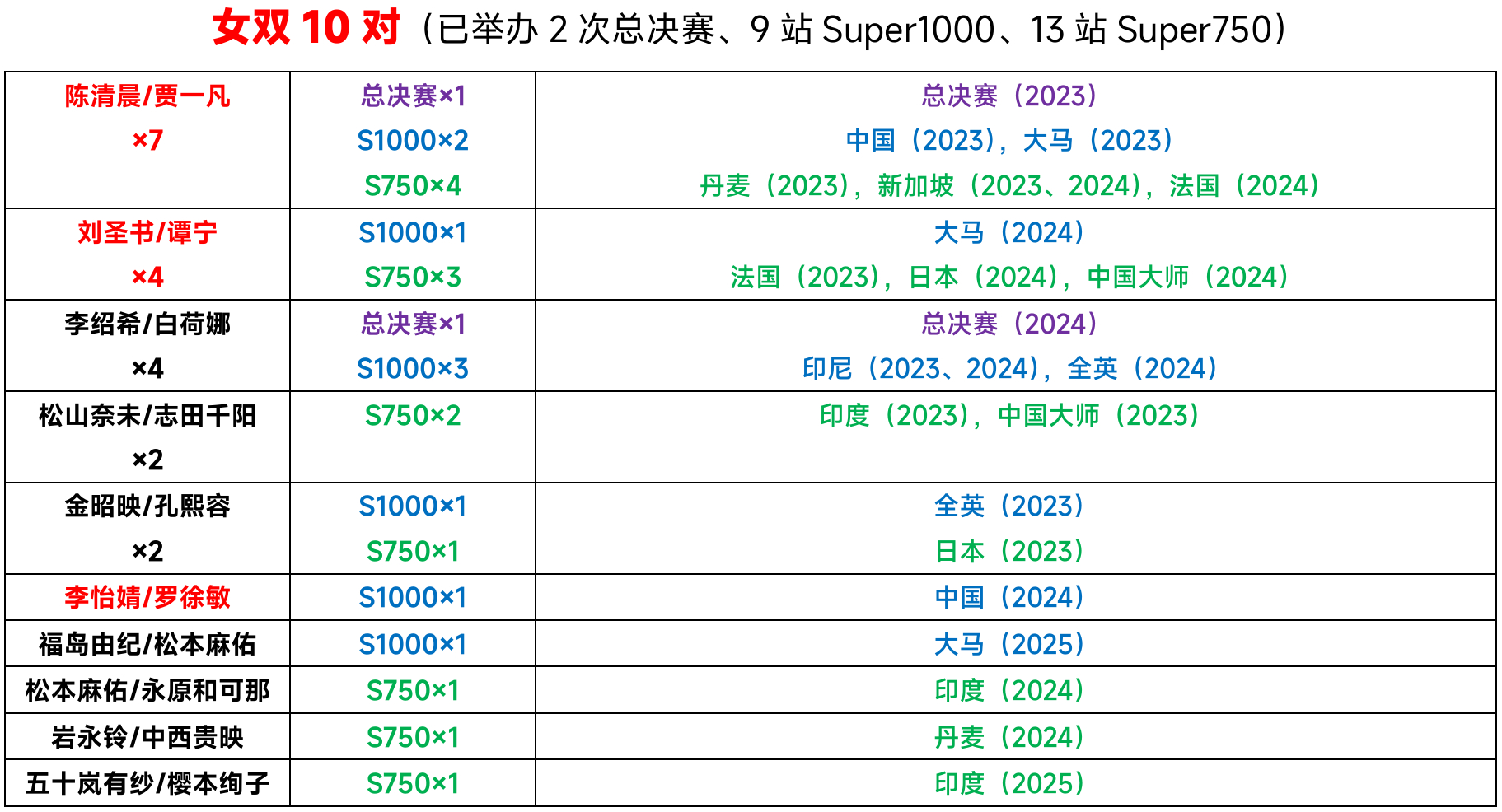 【2018-2022巡回赛季和2023-2026巡回赛季的高级别巡回赛女双冠军分布】