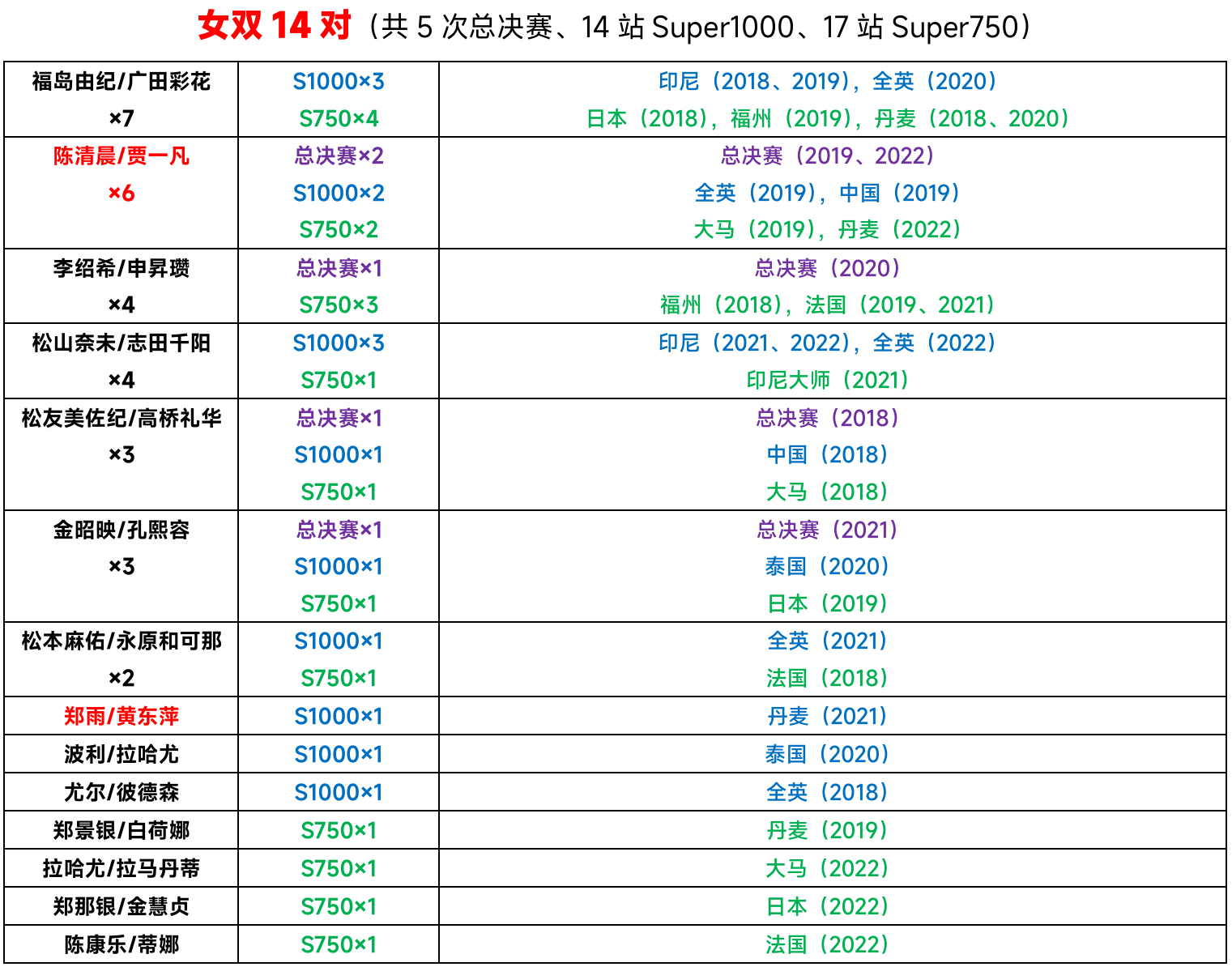 2018-2022巡回赛季:🇯🇵福岛由纪/广田彩花位居第一,此赛季日本女双集团优势明显